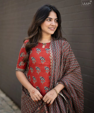 Rustic Red Bloom Handloom Cotton 3-Piece Set with Pockets