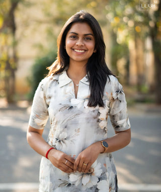 Whispering Petal Grey Muslin Kurti with Elbow Sleeves