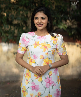 Halfwhite & Yellow Striped Floral Cotton Kurti – Casual Wear