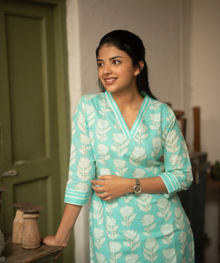 Seafoam Blossom Cotton Co-ord Set with 3/4 Sleeves