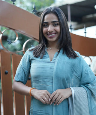 Aqua Fern Linen Zari Silk Kurti with Shawl – Casual Elegance