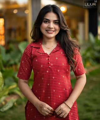 Crimson Check Cotton Kurti with Elbow Sleeves – Everyday Comfort