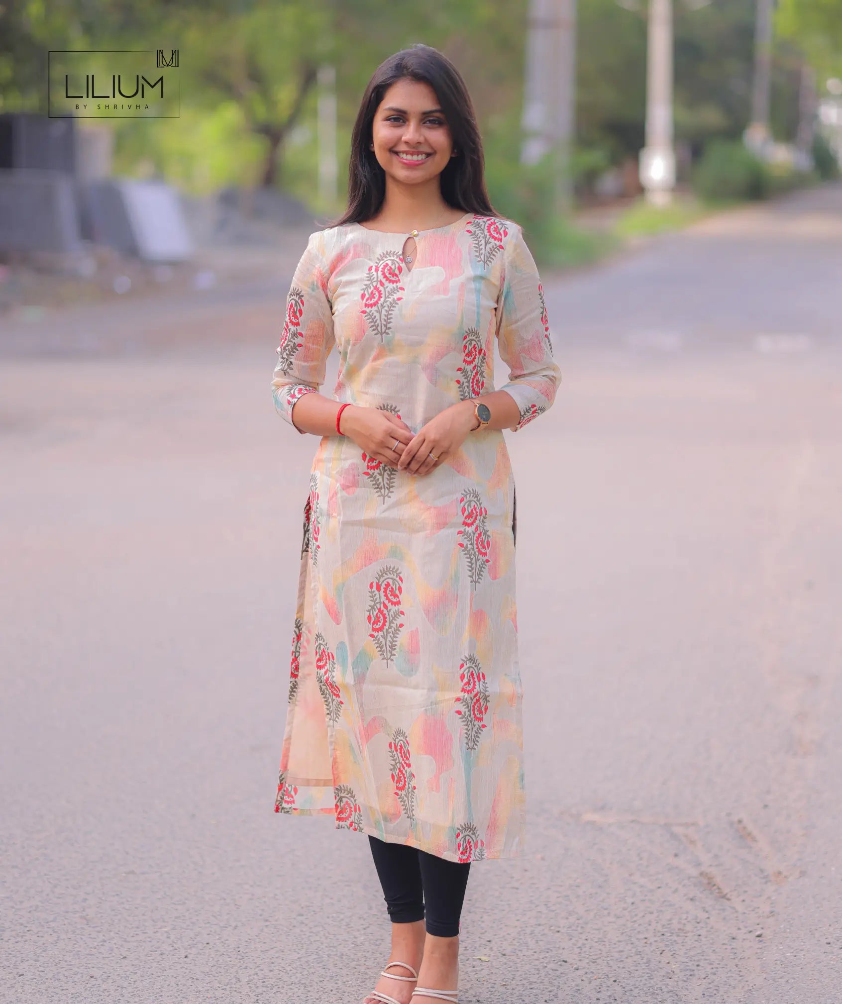 Discover effortless style with this Cream Grace Cotton Kurti, designed for comfort and casual elegance. Crafted from soft, breathable cotton, this kurti is perfect for everyday wear, offering a flattering fit with a sleek slit opening.