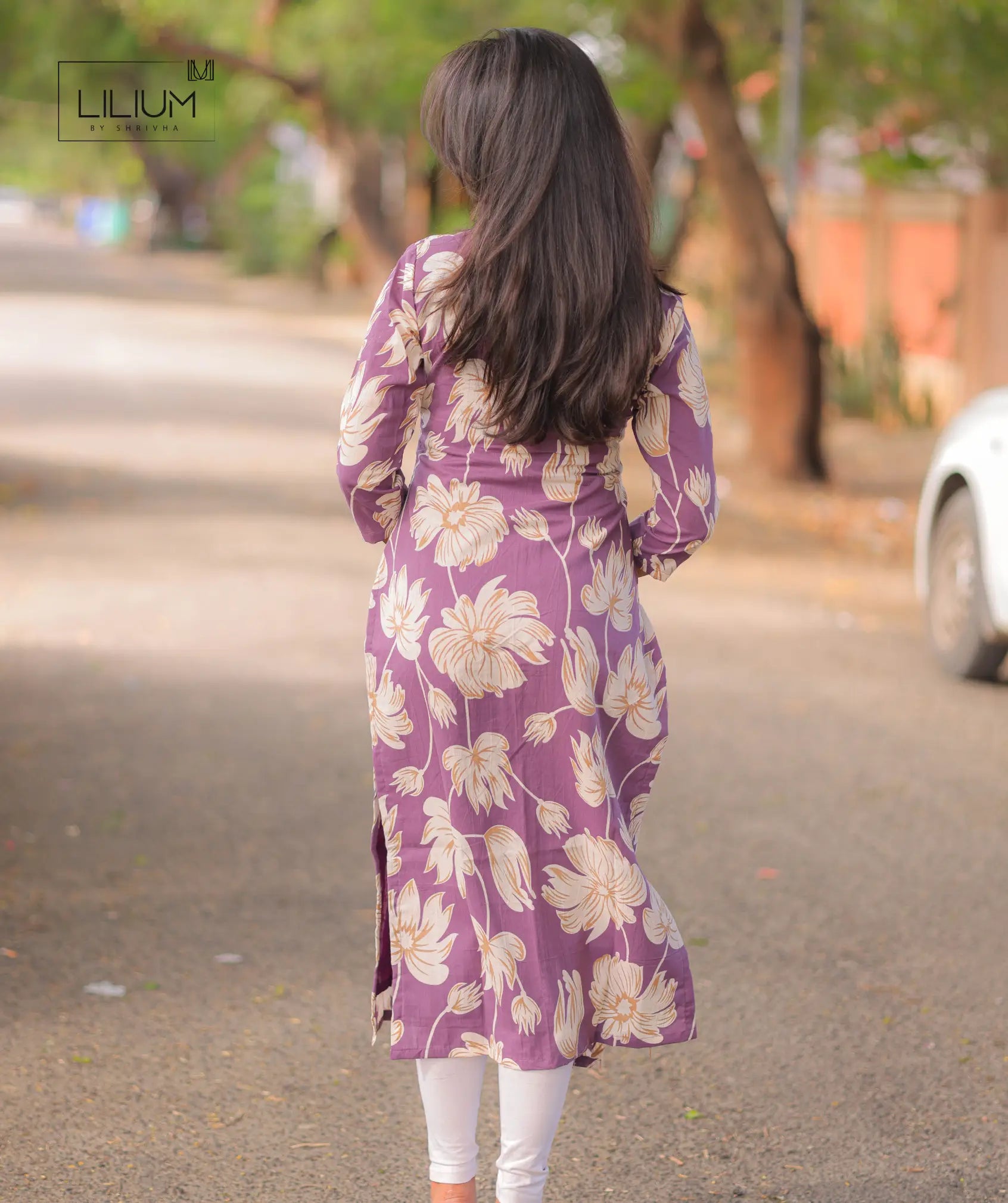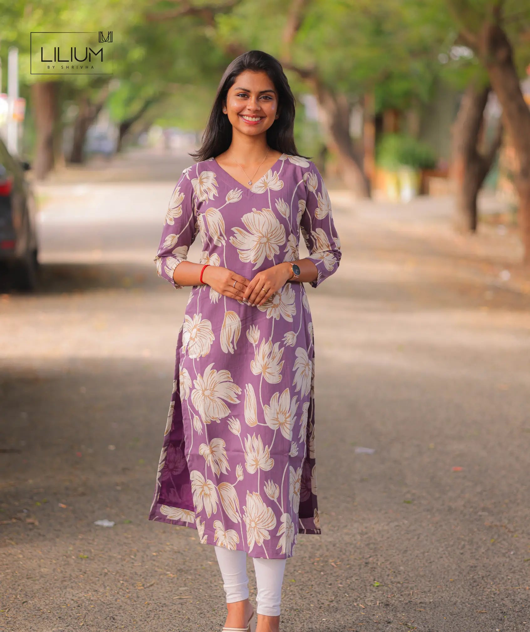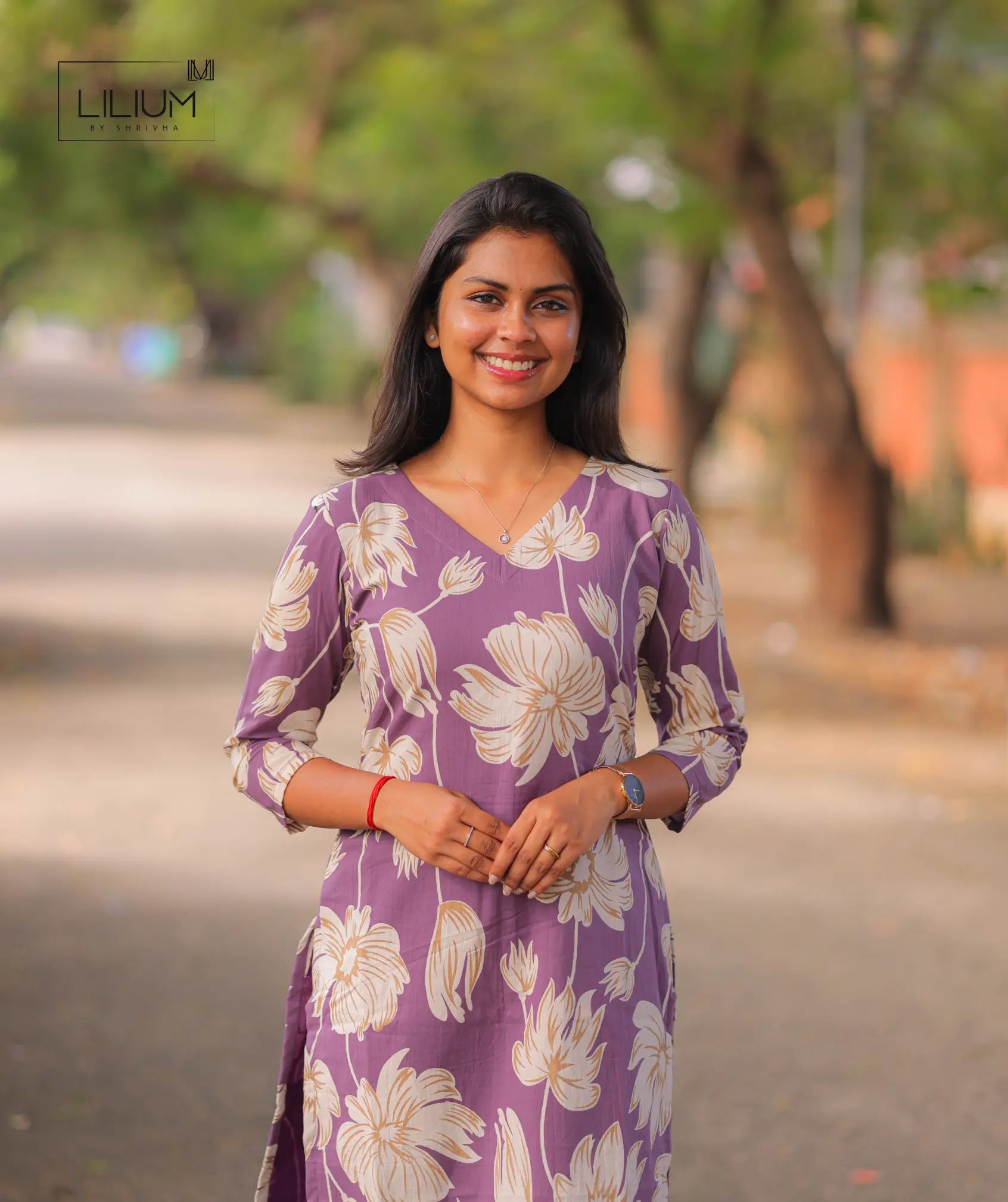 Floral Lavander Cotton Kurti with Open Slit & 3/4th Sleeves