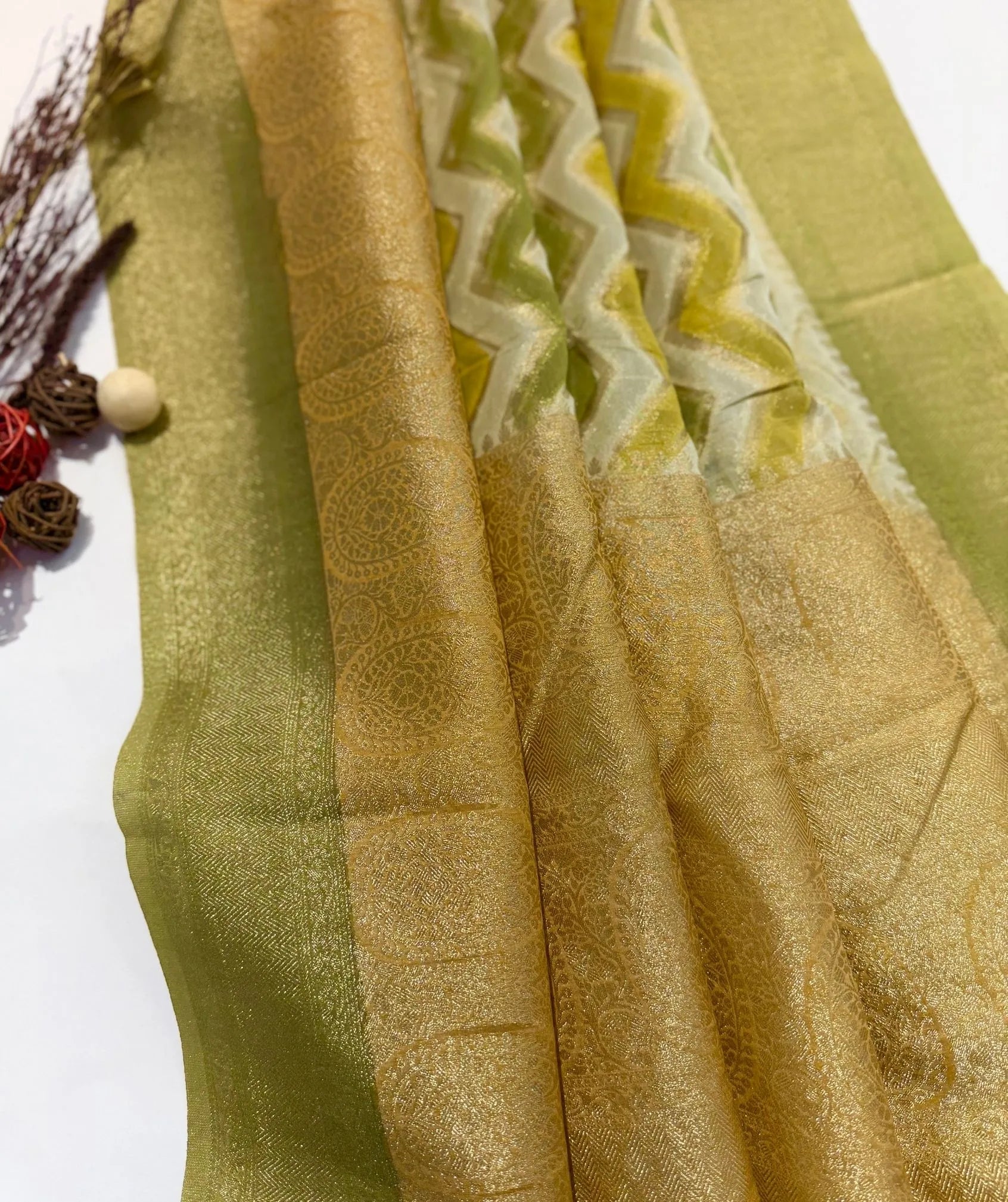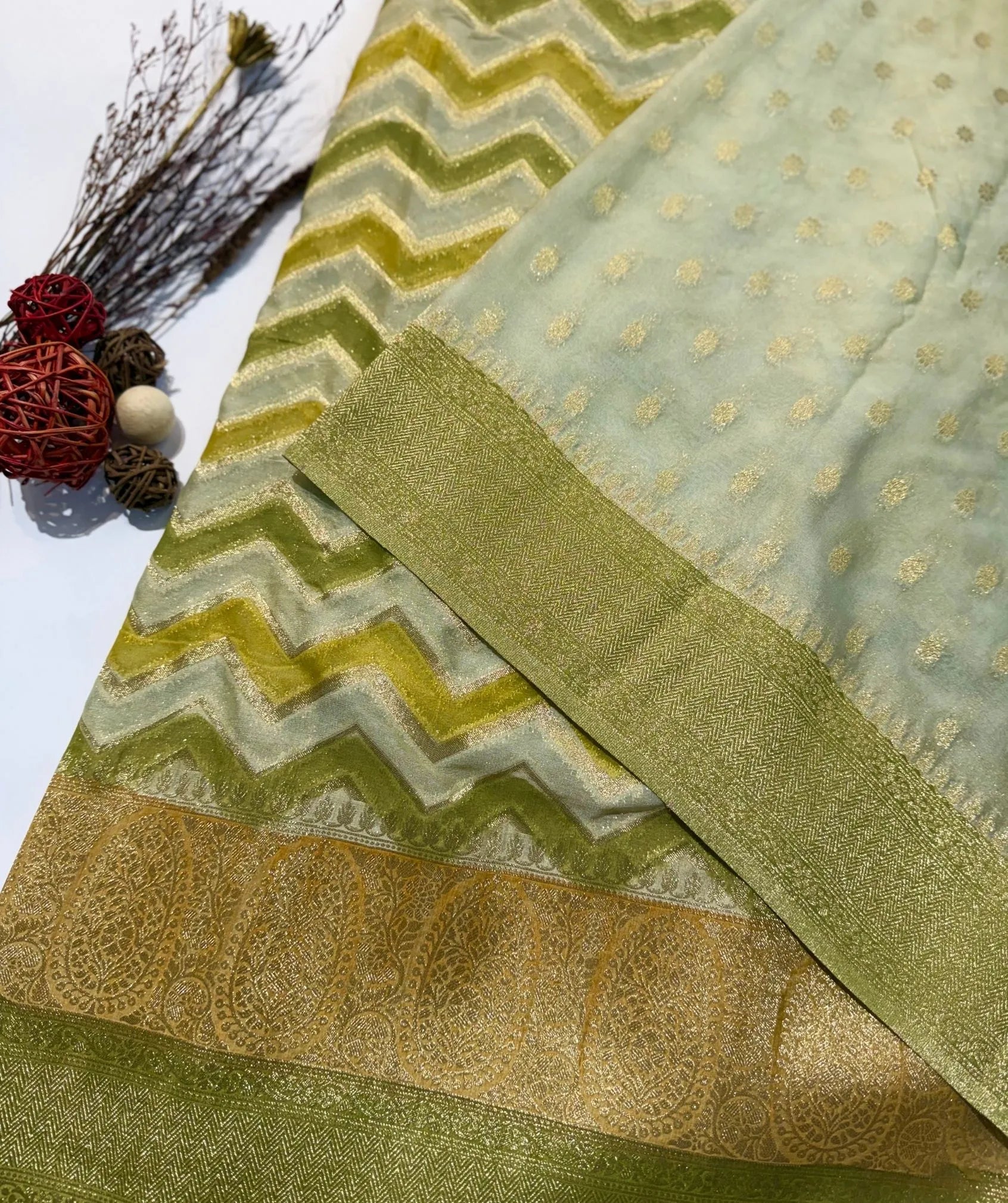 Tender Pista Banaras Saree with Rich Zari Weave