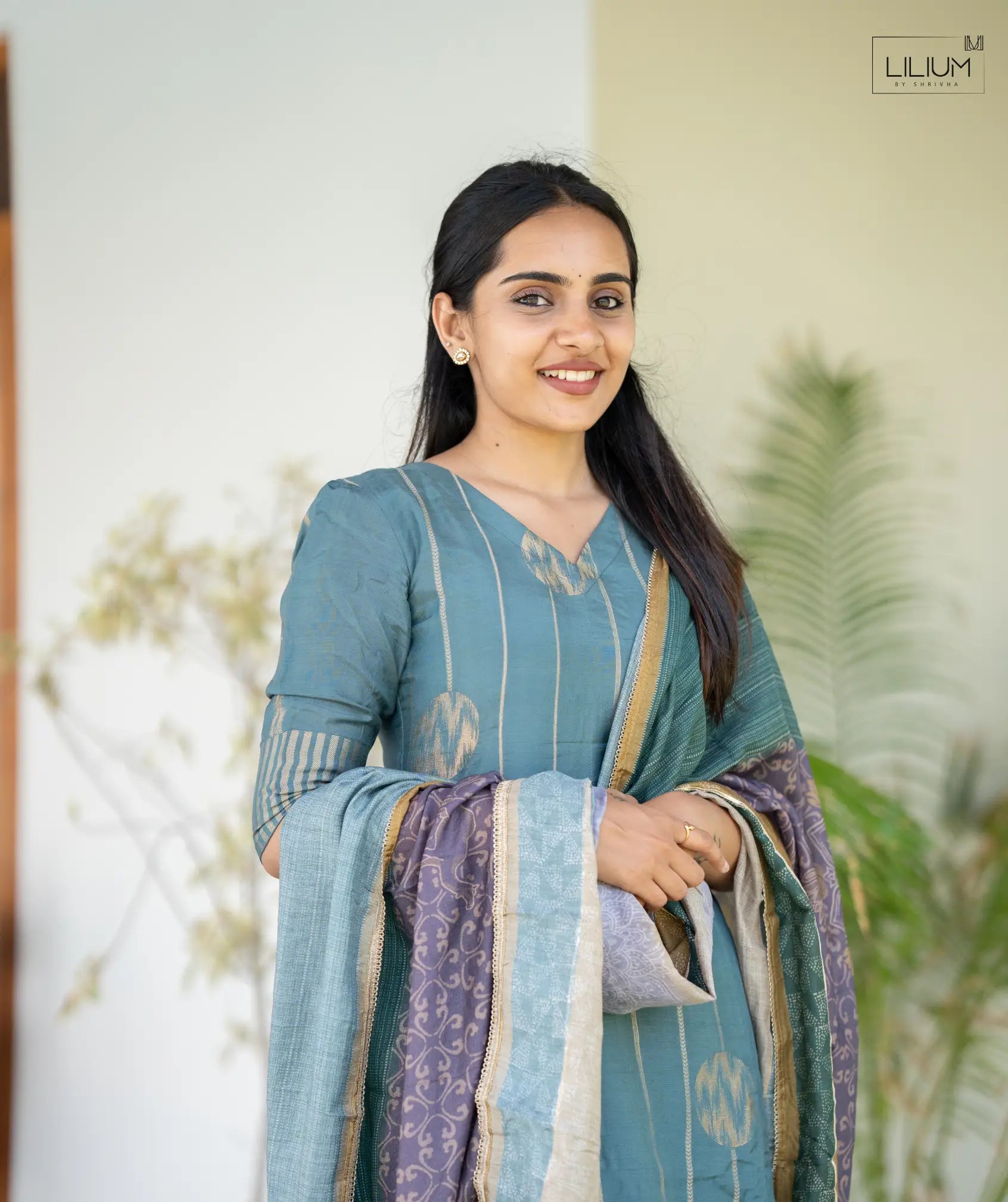 Princely Blue Linen Slub Kurti with Shawl - Festive Wear