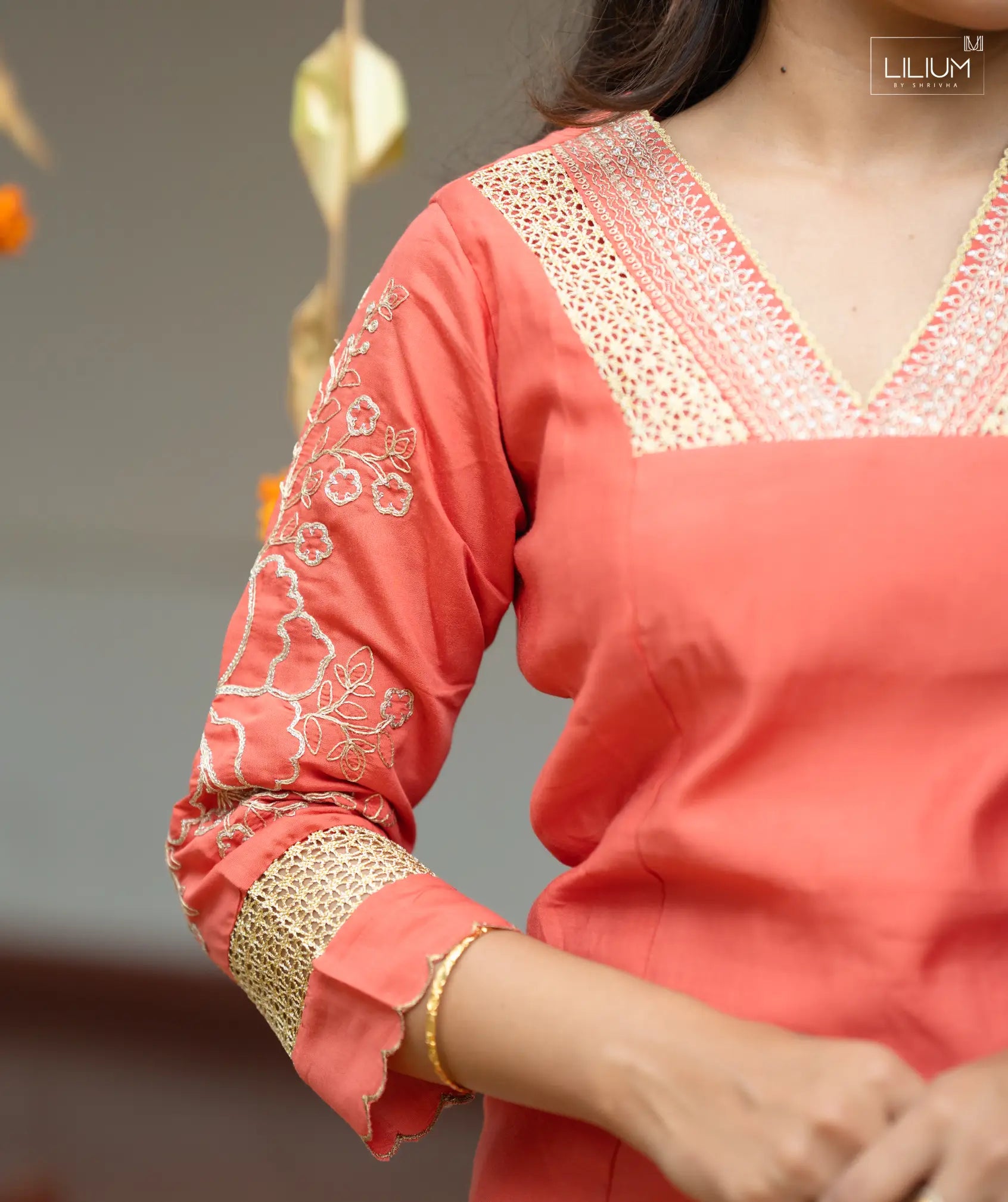 Coral Crown Muslin 3-Piece Lace Work Festive Set