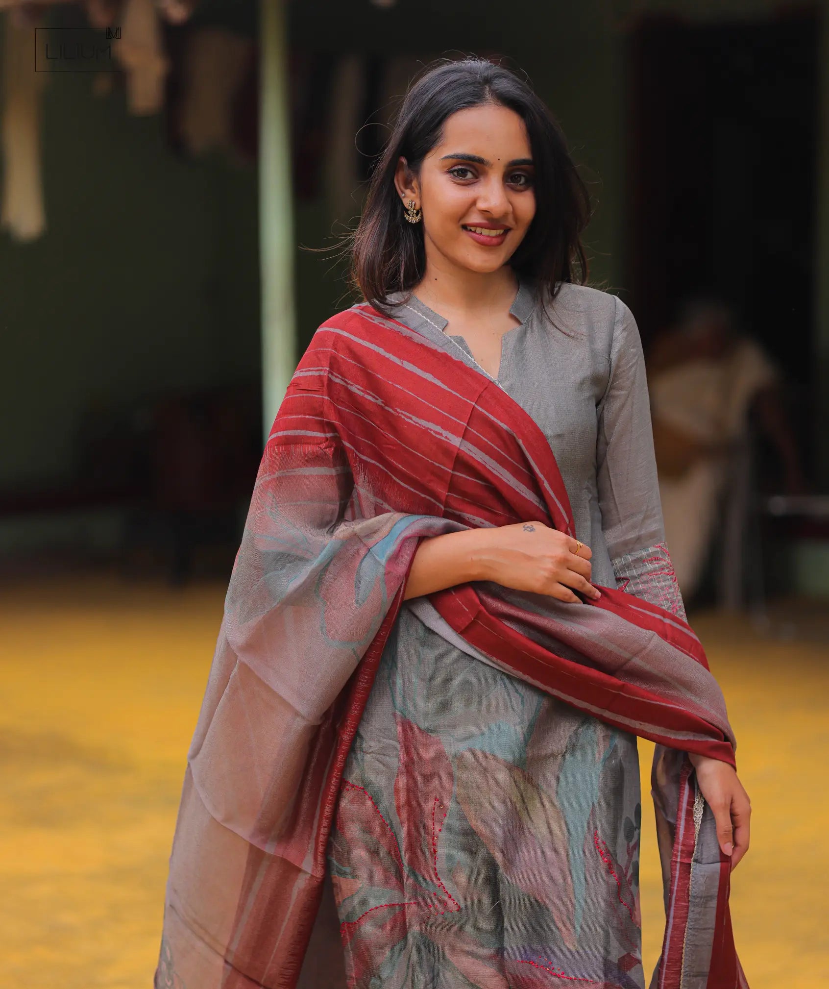 Elevate your everyday elegance with the Crimson Crown Tissue Silk 3-Piece Set, crafted for women who love refined comfort. Made from premium tissue silk, this ensemble features a 46-inch top with open slit, paired with a 38-inch full-elastic bottom and a matching dupatta for a complete look. The 3/4th sleeves and side pockets enhance functionality and grace, making it perfect for casual or semi-festive occasions.