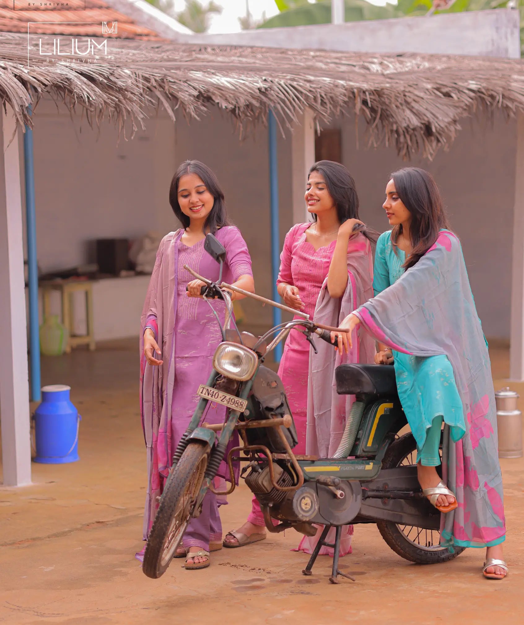 Elevate your festive wardrobe with the Duchess Lavender Linen Slub 3 Piece Set, designed to blend tradition with elegance. Made from premium linen slub fabric with zari detailing, this set carries a subtle shimmer that makes it perfect for festive wear and celebrations. The 43-inch top length features an open slit design, giving the outfit a graceful fall and easy movement. With 3/4th sleeves (13 inches), a comfortable fit, and lining for added durability, this outfit is crafted to meet both style and comfort. The addition of functional pockets brings modern practicality to a timeless ethnic set. Styled in a serene lavender shade, this 3 piece kurti set with dupatta and bottom is ideal for weddings, festive gatherings, and traditional events. A perfect choice for women who want an ethnic festive kurti set that shines with zari craftsmanship and adds charm to every celebration.