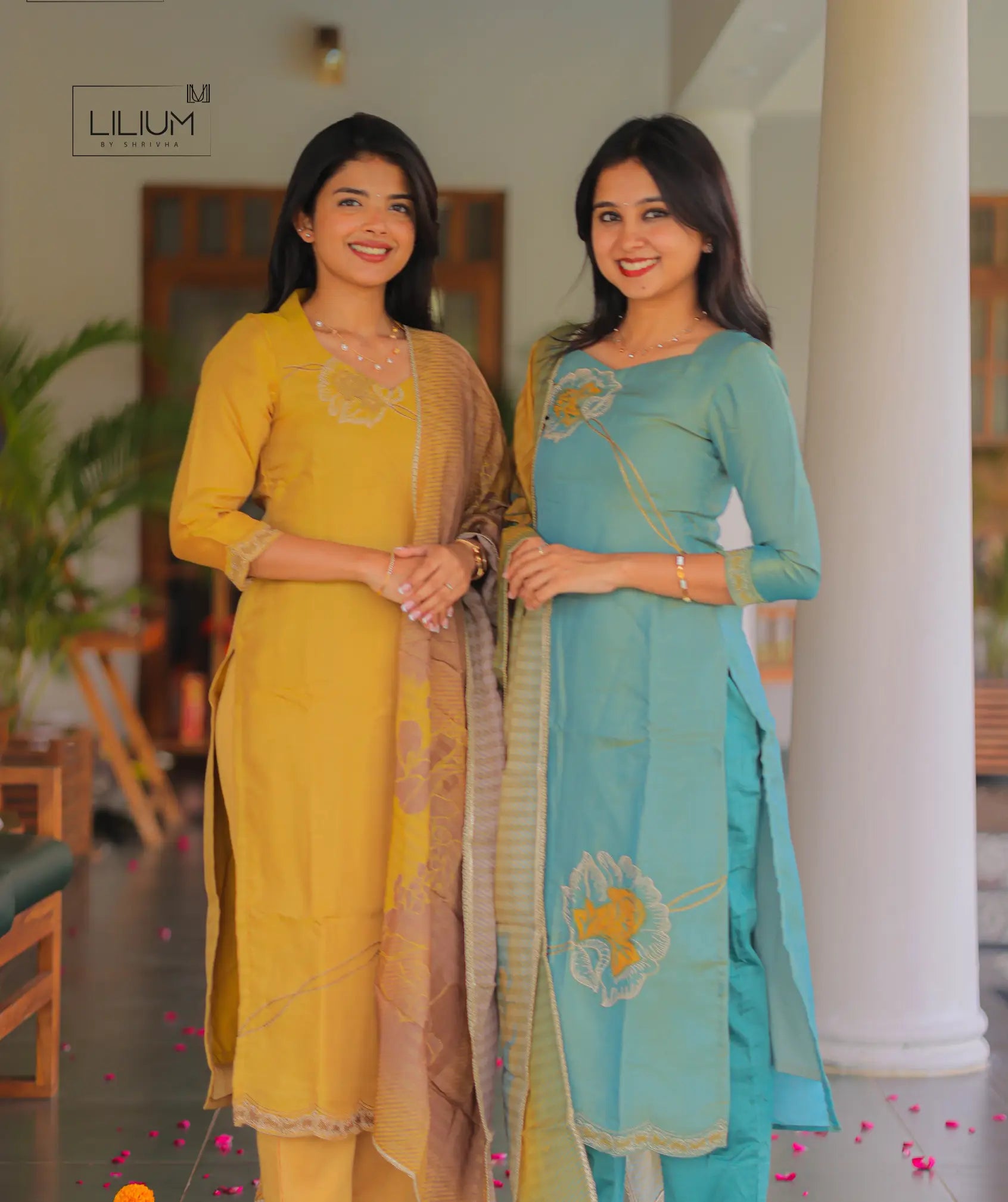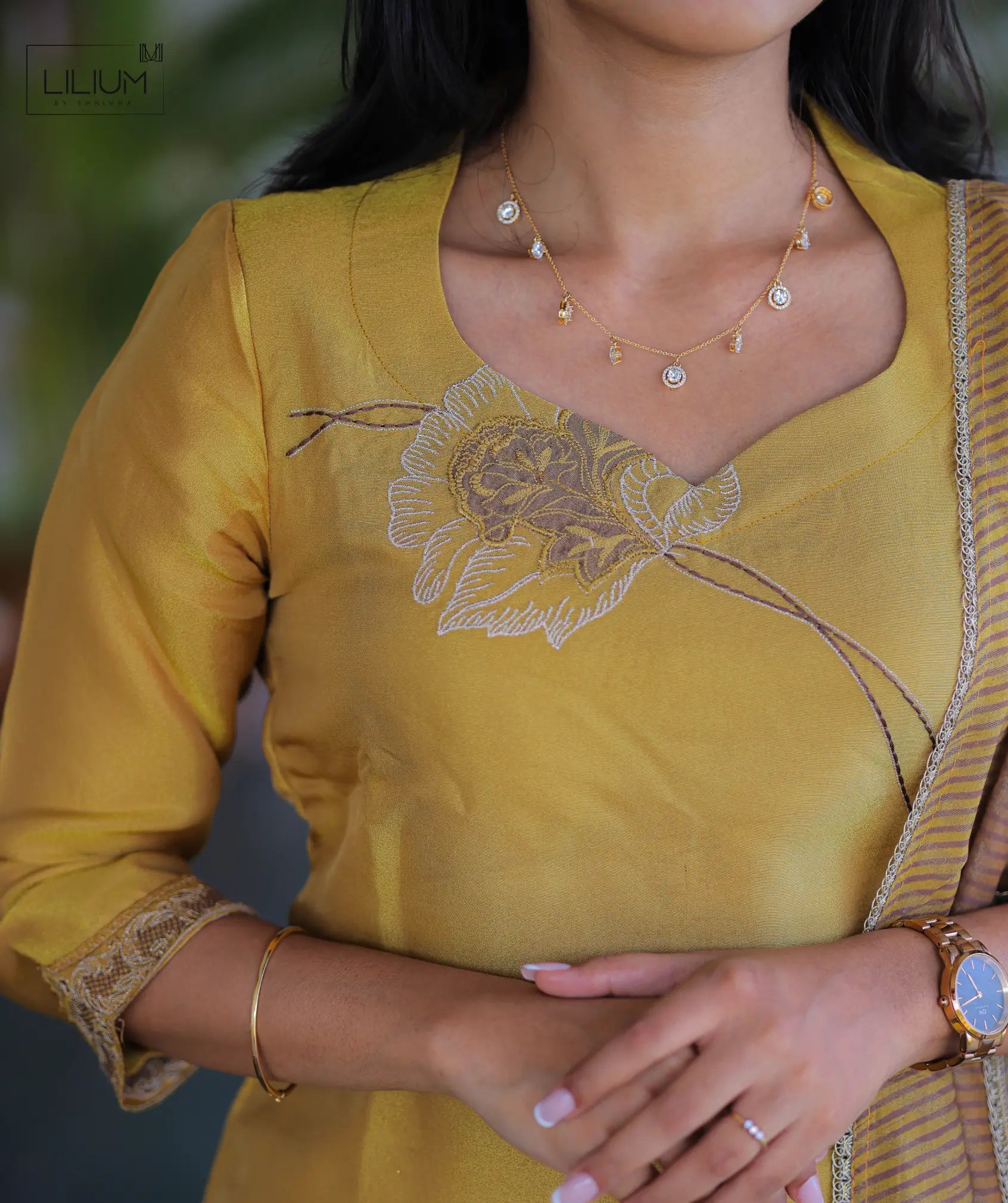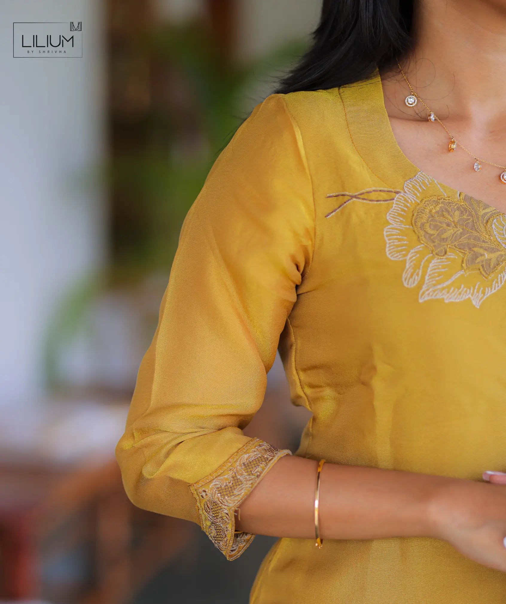 The soft, luxurious texture of muslin silk is complemented by a rich, golden hue that exudes understated elegance. Perfect for festive/casual wear, this set is designed to make you feel stylish and comfortable all day long. Its practical pockets and lining make it a versatile addition to your wardrobe.