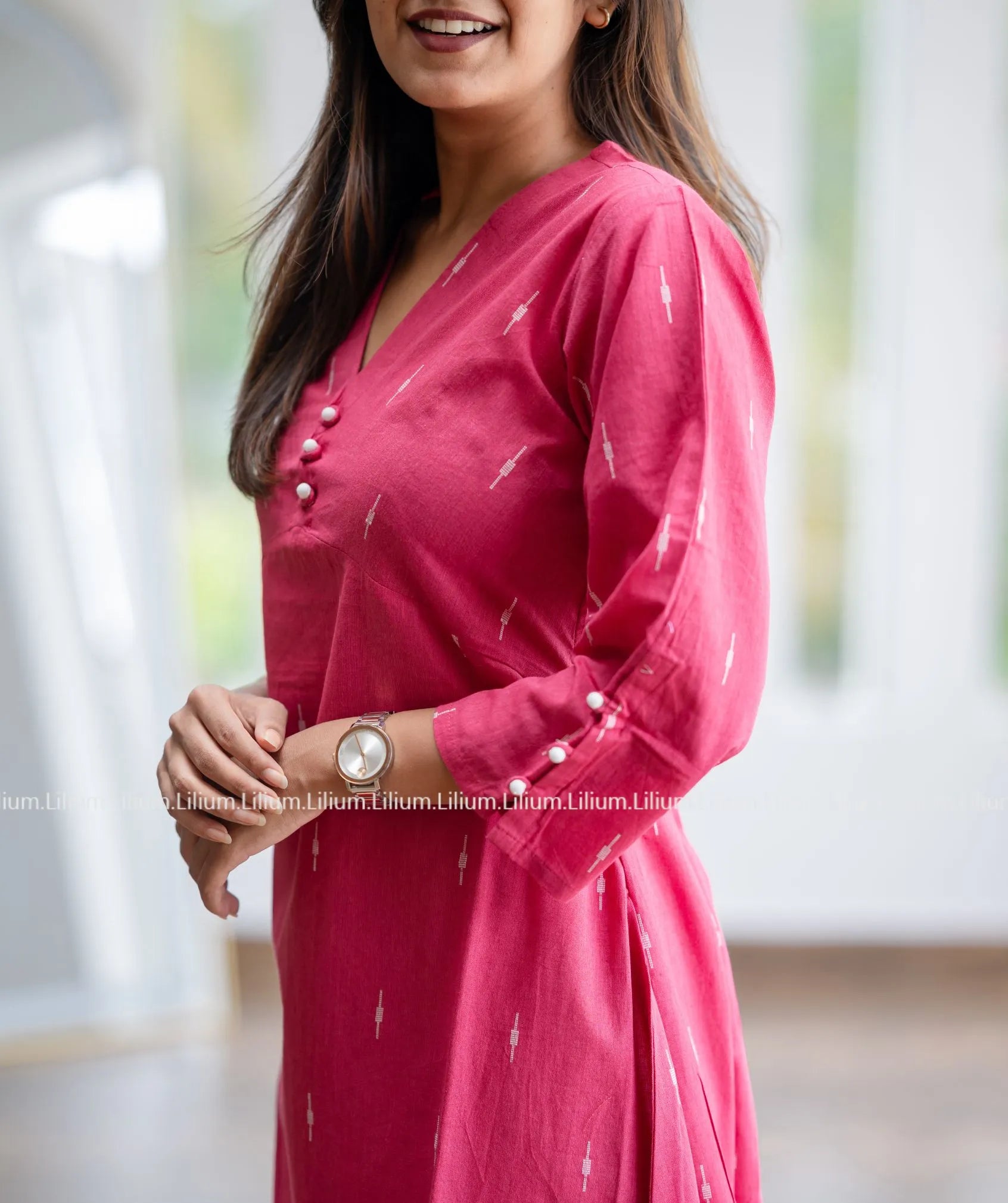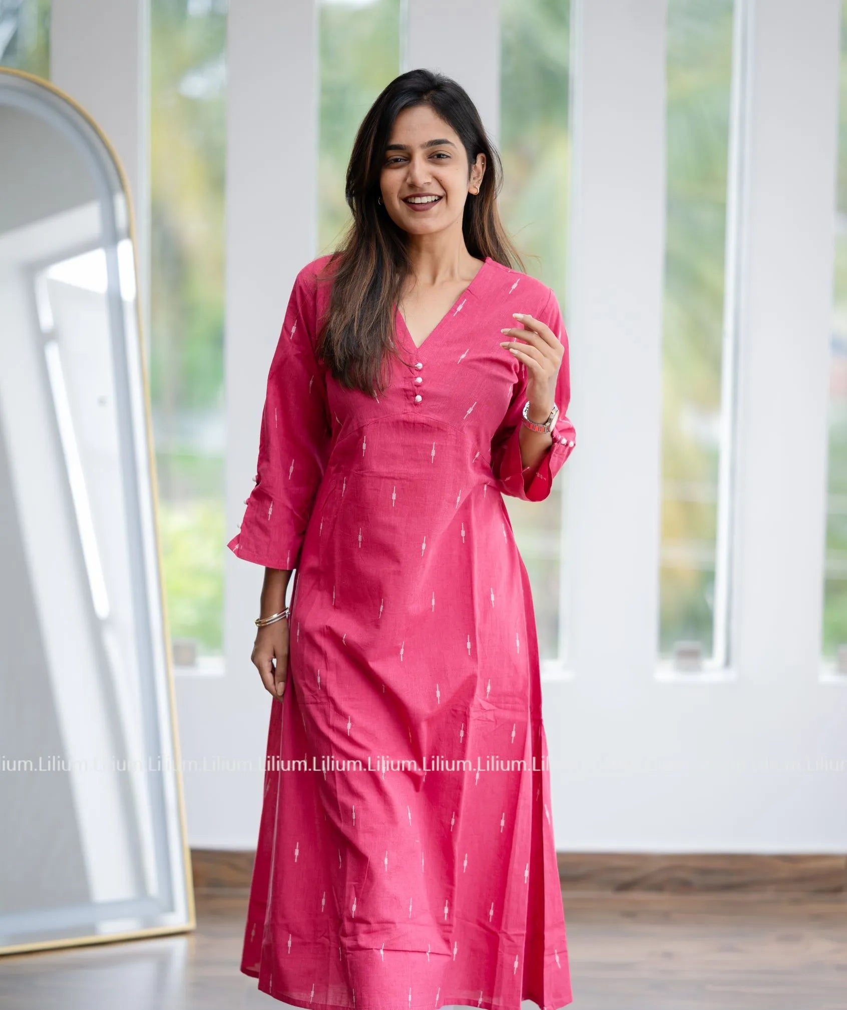 Pink Handloom Cotton Aline Kurti - Casual Wear