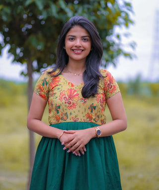 Festive Maxi Dress in Yellow & Emerald Green Chanderi Silk