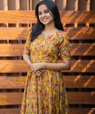Fenugreek Bloom Cotton Maxi Dress – Yoke-Lined Grace
