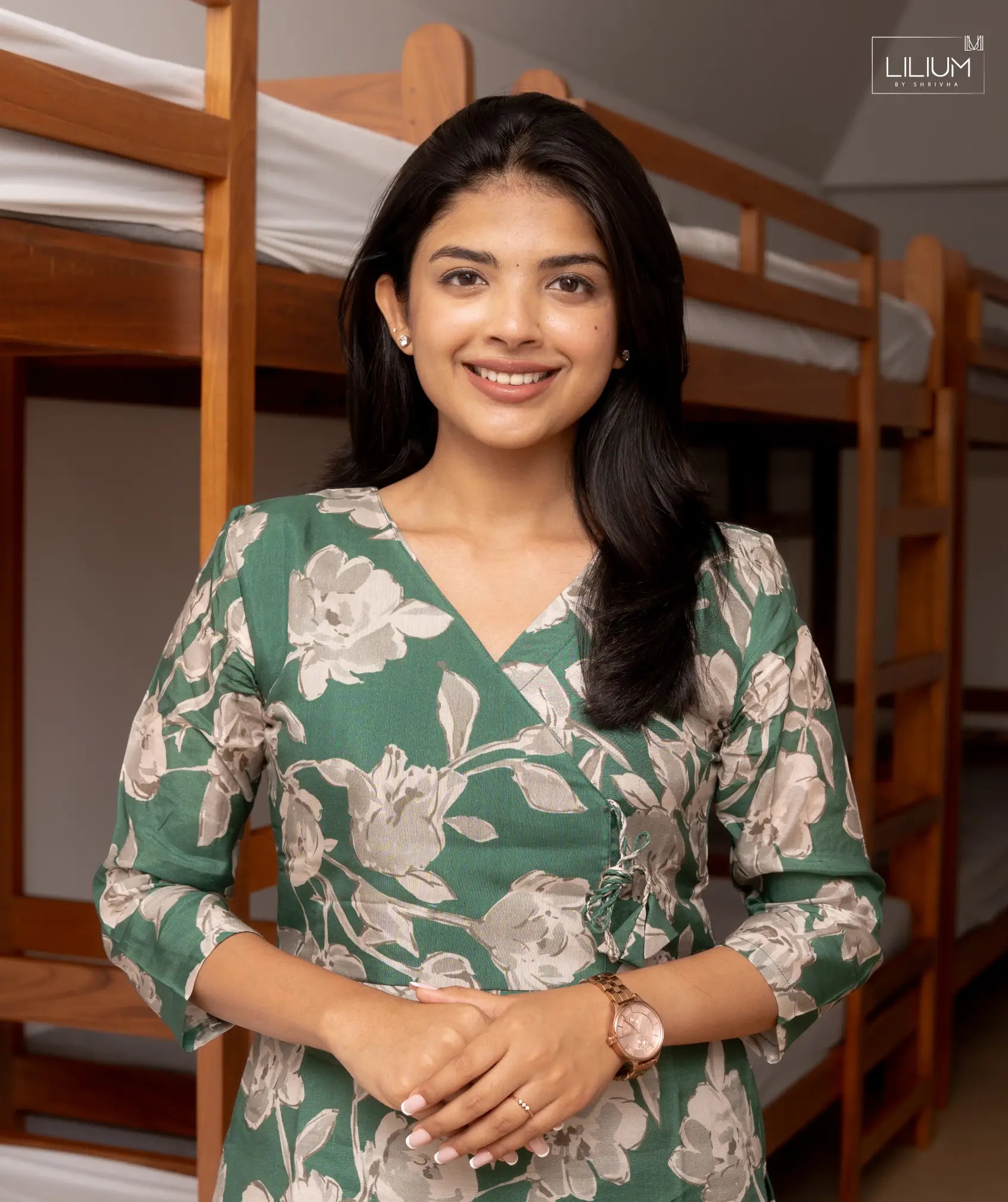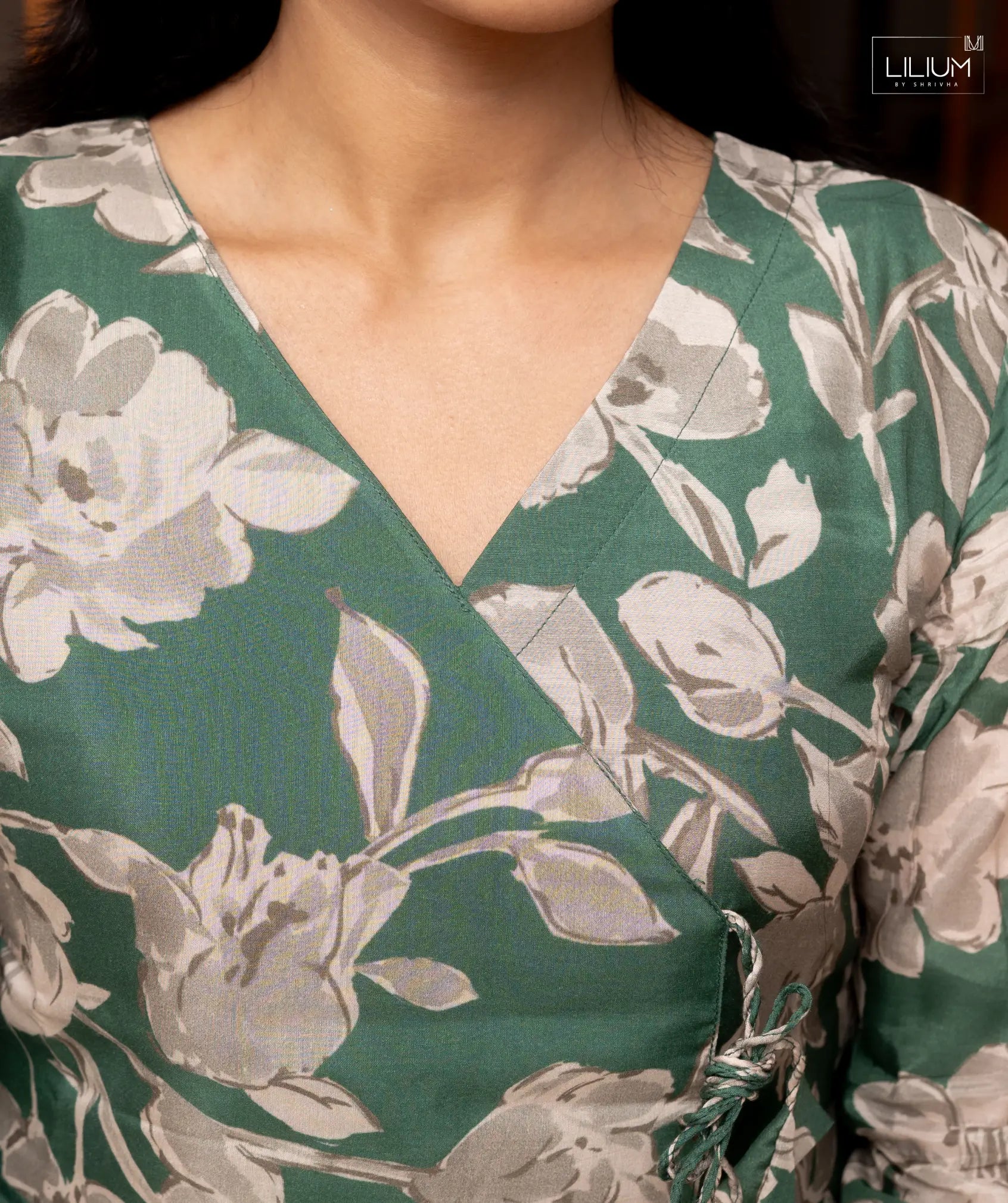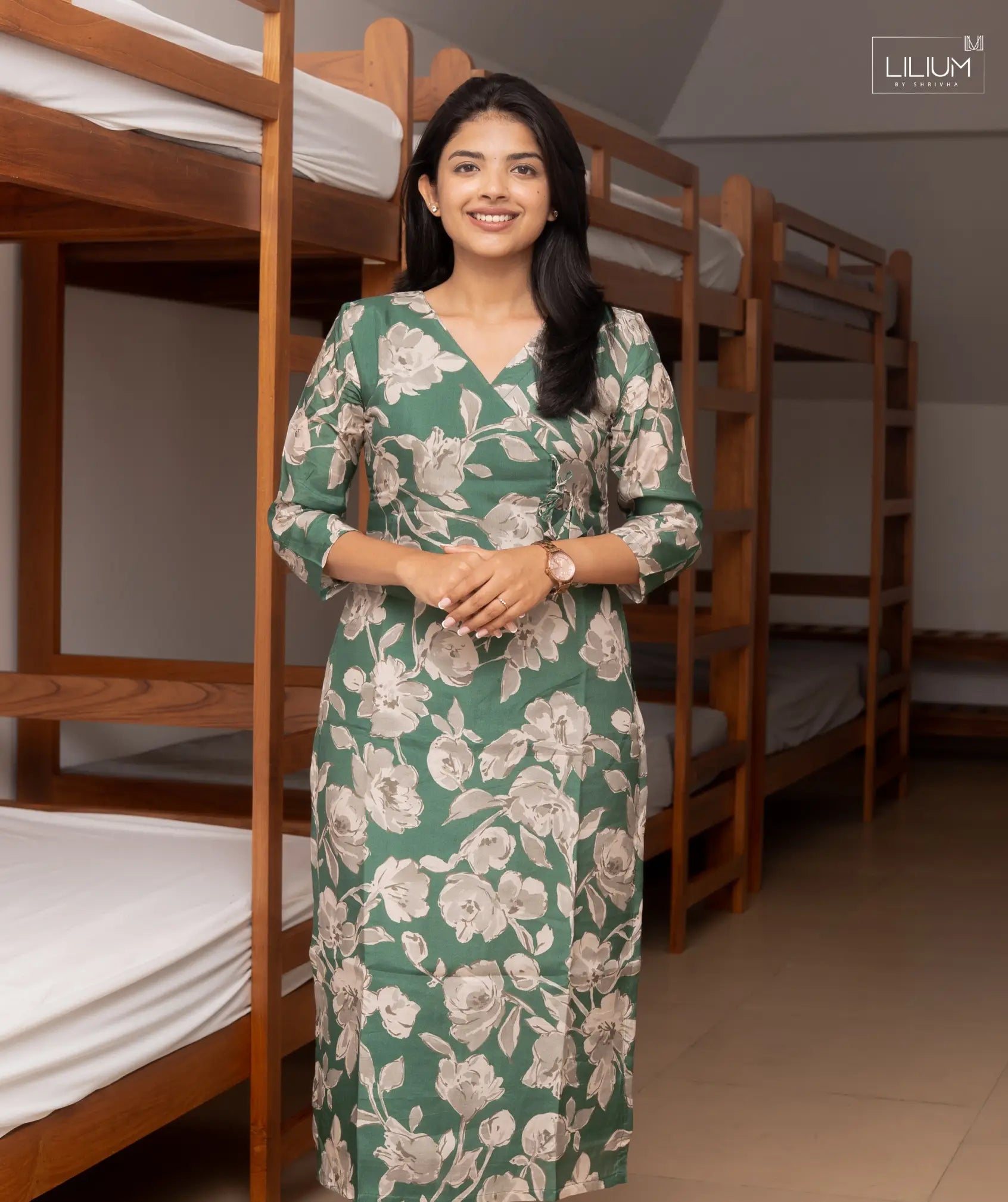 Mossy Glow Muslin Kurti with Open Slit and 3/4 Sleeves