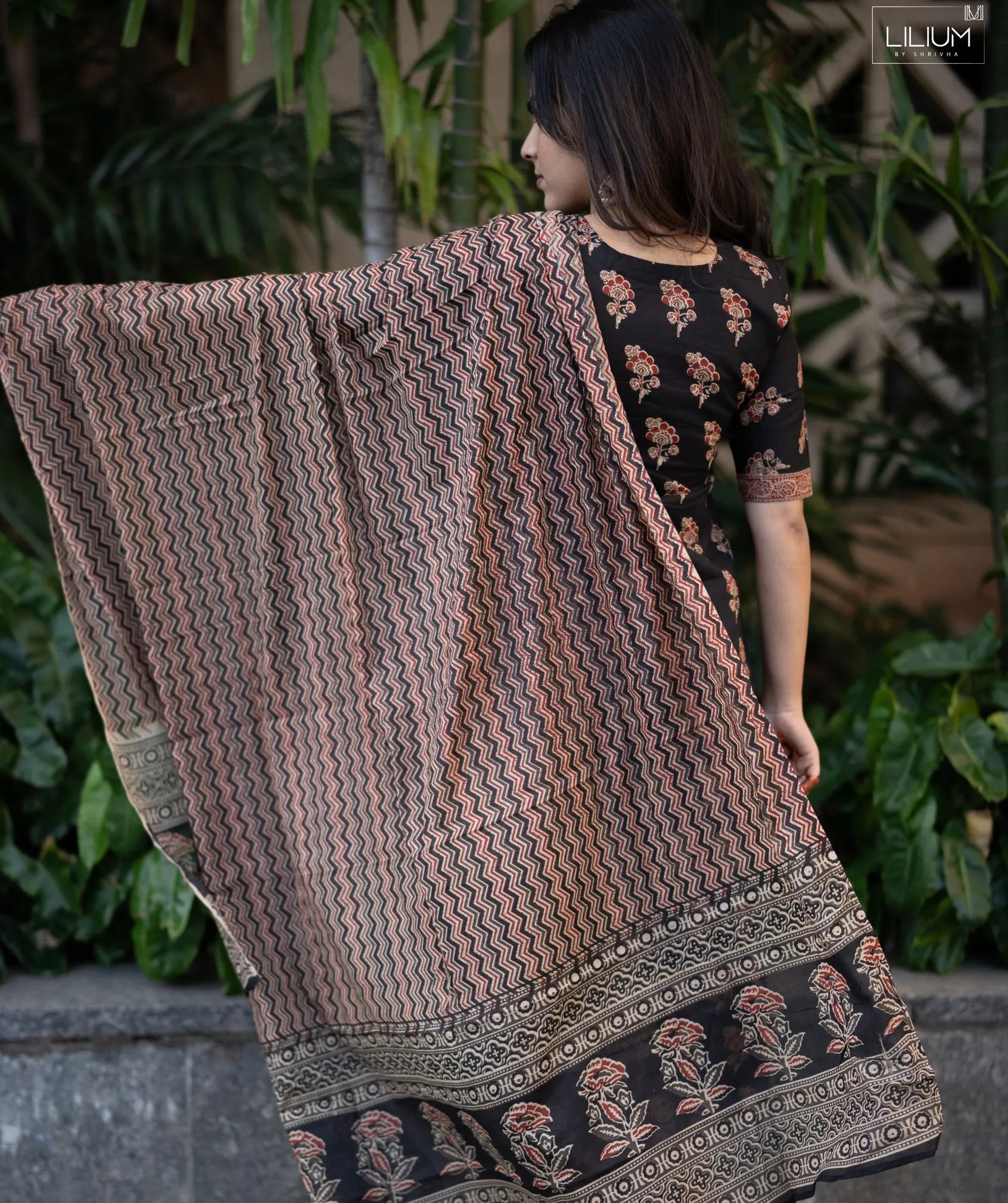 Black Ember Floral Handloom Cotton 3-Piece Set with Pockets