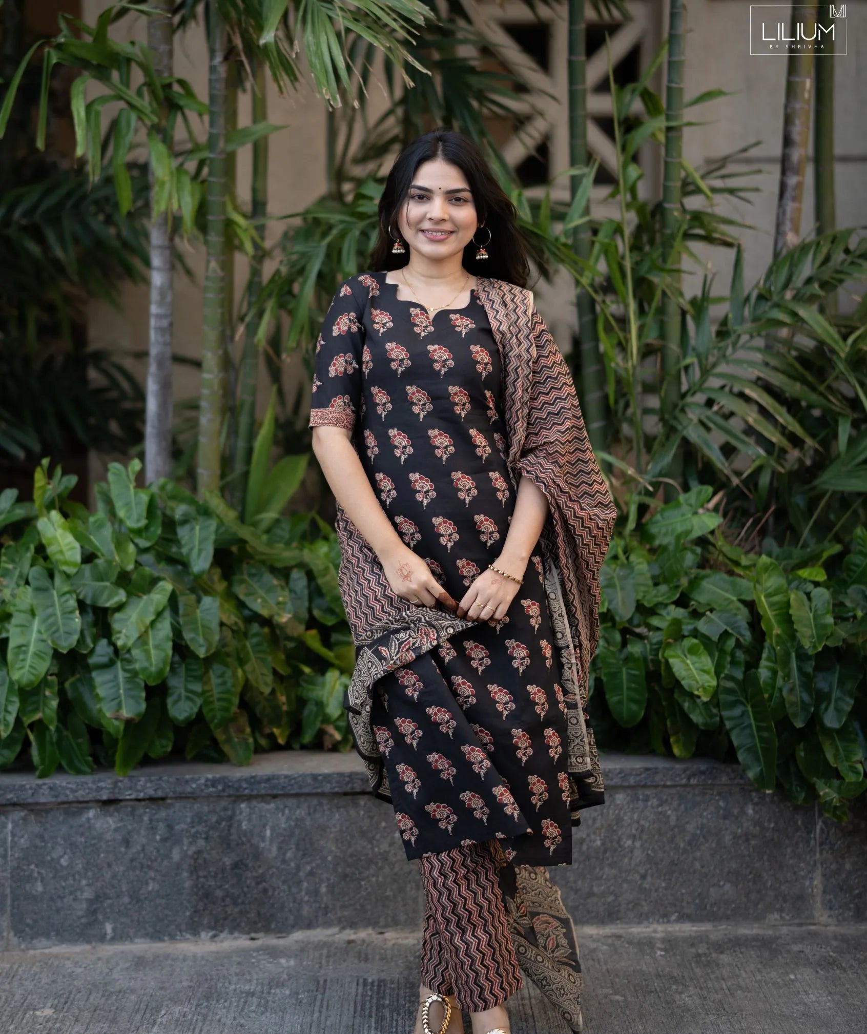 Refresh your everyday style with this Black Ember Floral Handloom Cotton 3-Piece Set, designed for comfort and effortless elegance. Crafted from breathable handloom cotton, the set features a 44-inch top with elbow sleeves, offering a relaxed yet polished look. The lined construction ensures added comfort, while the inclusion of functional pockets enhances practicality.
