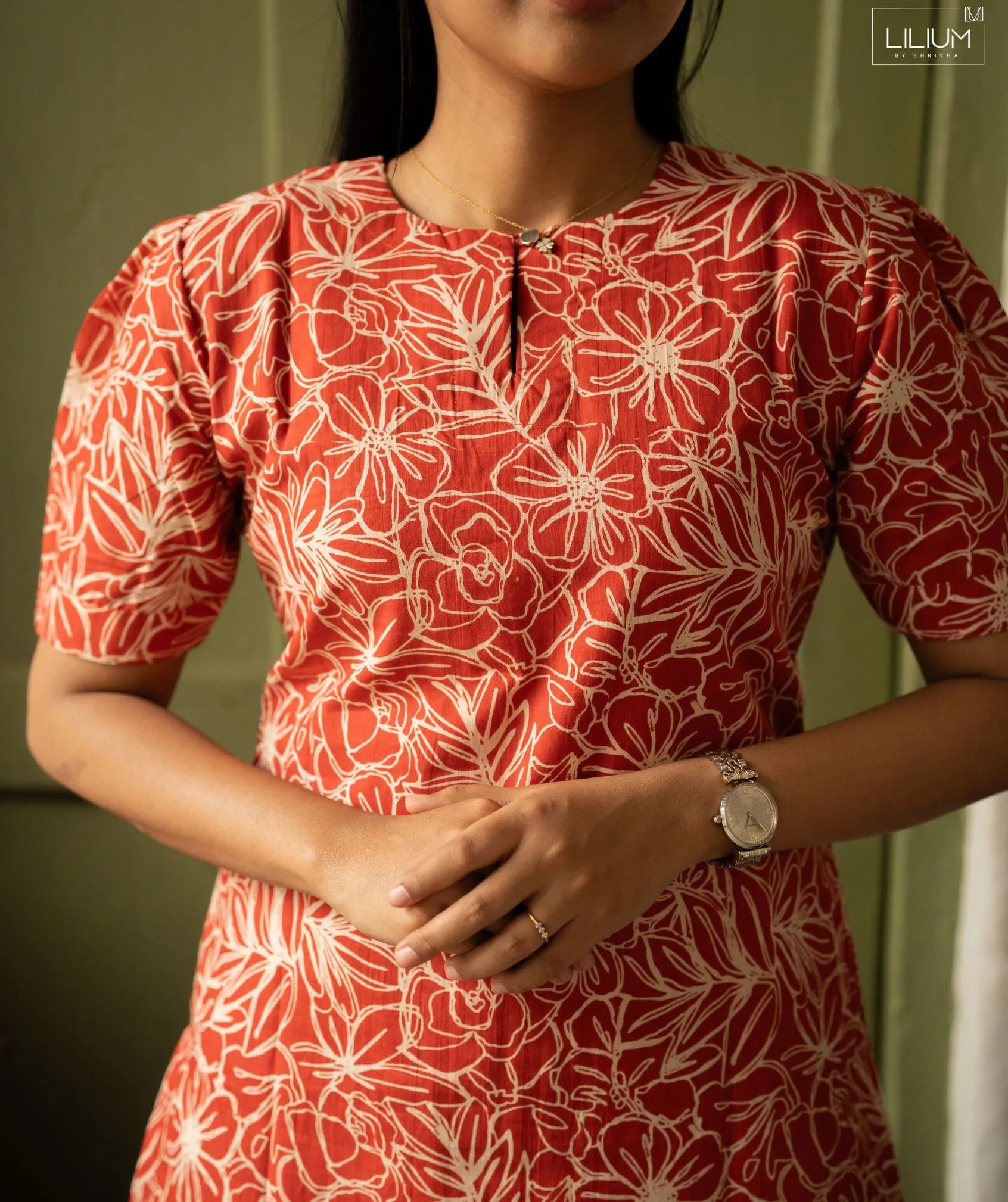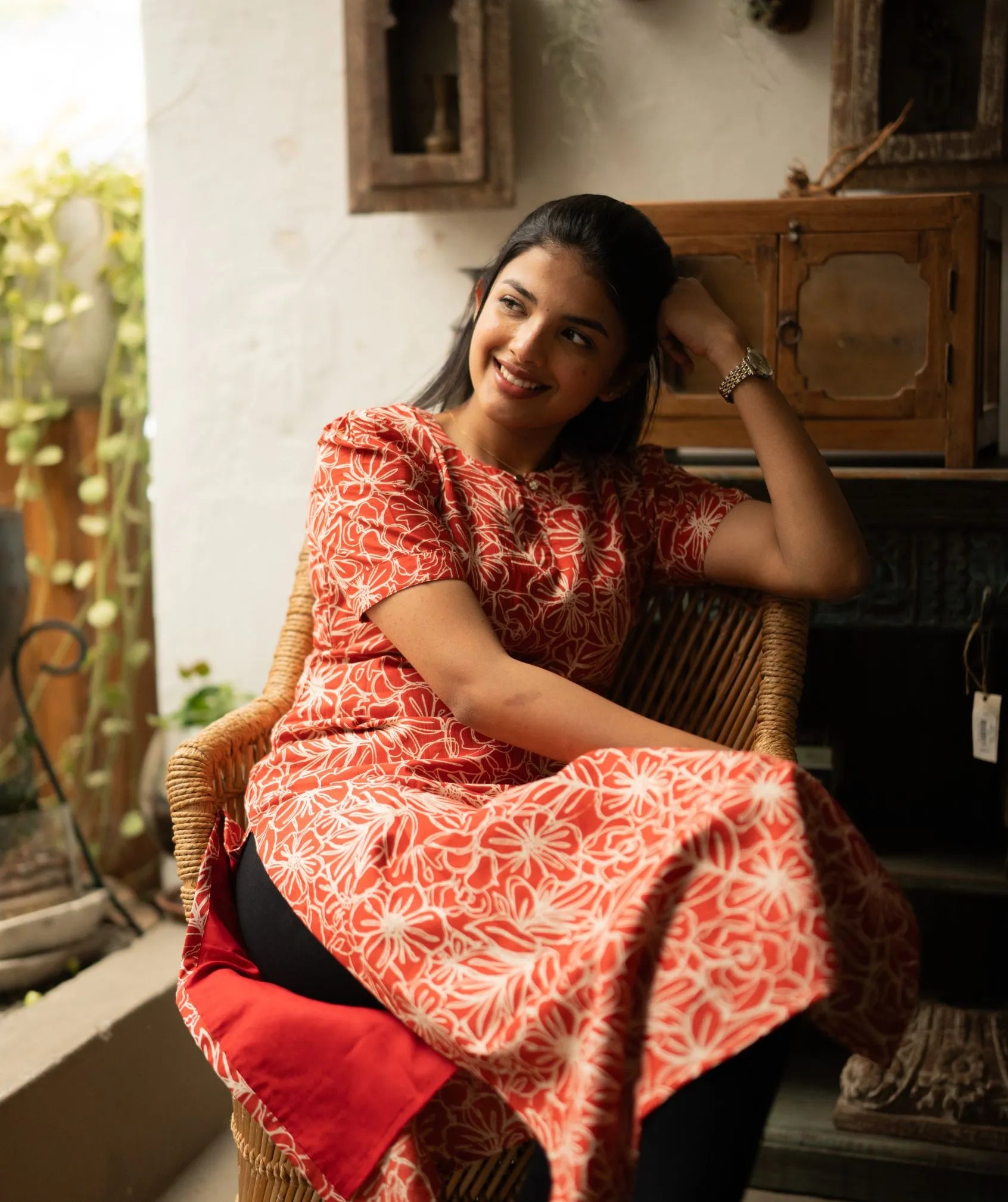Crimson Wildflower Cotton Kurti with Elbow Sleeves