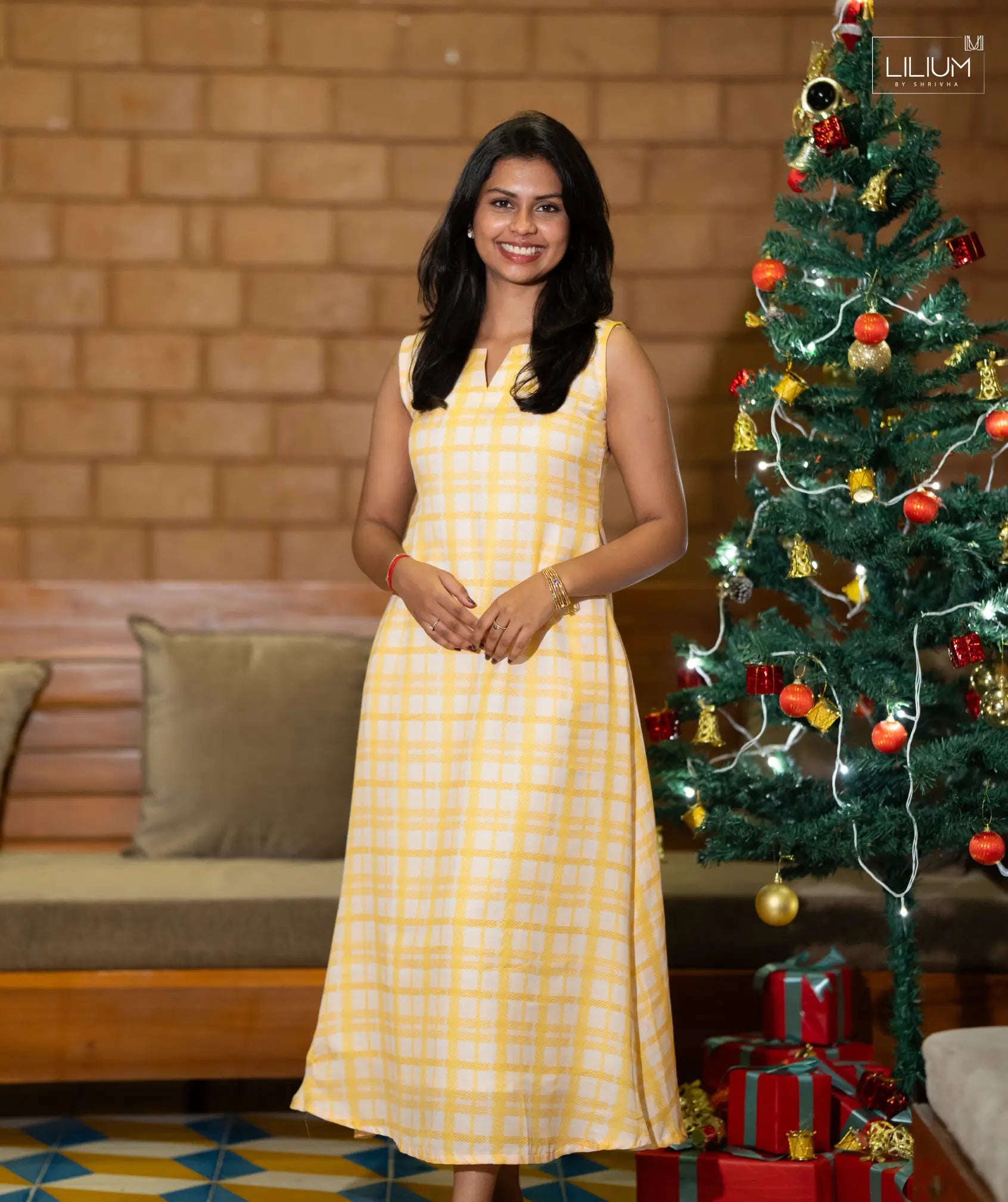 Designed with functional pockets, this dress blends practicality with elegance. The sleeveless design features attached inner sleeve fabric, offering added coverage and versatility without altering the outer look. Fully lined for comfort, the Golden Noel color enhances its festive appeal while keeping the design refined and wearable. Perfect for celebrations, this jam cotton A line dress stands out for its thoughtful construction, ease of movement, and timeless festive style.