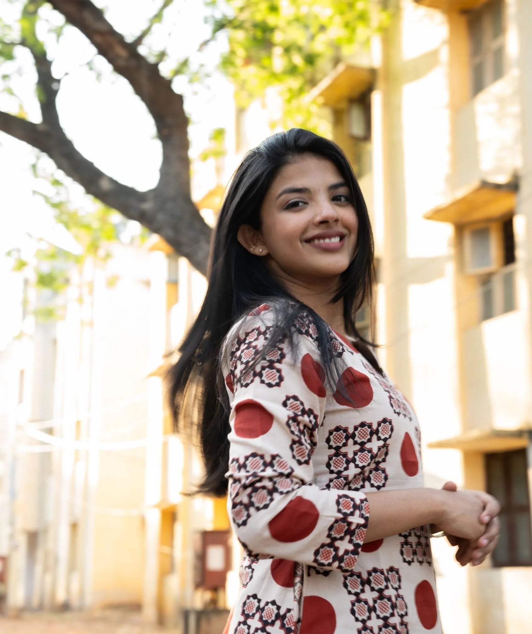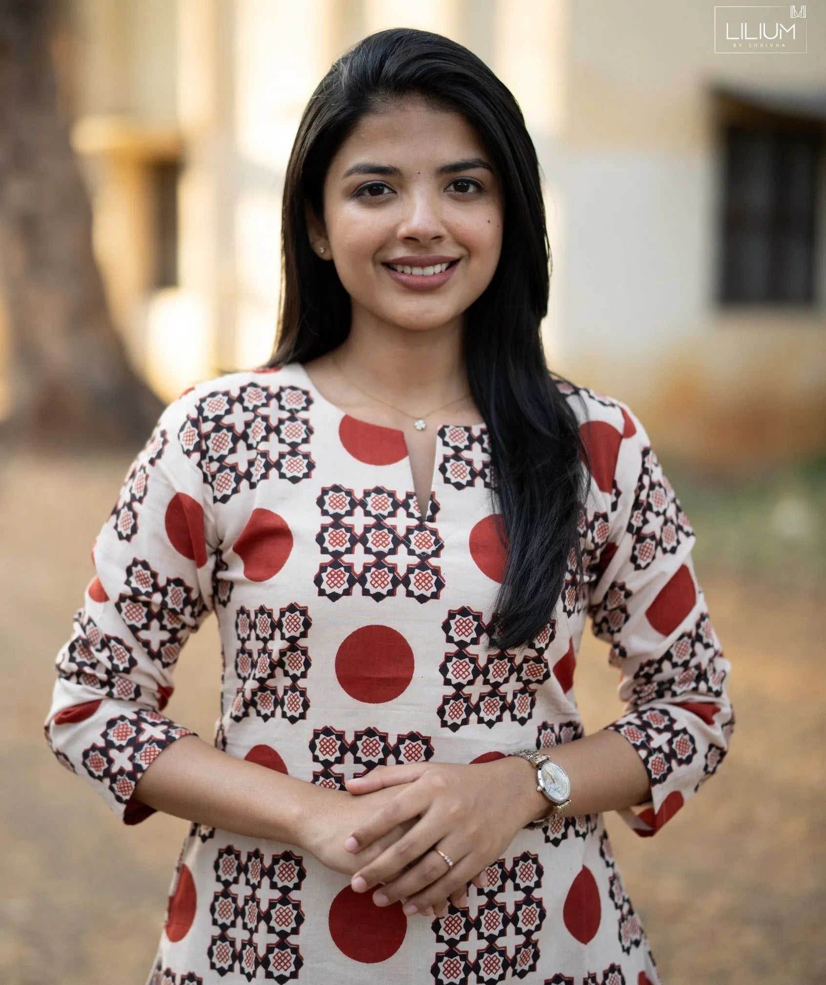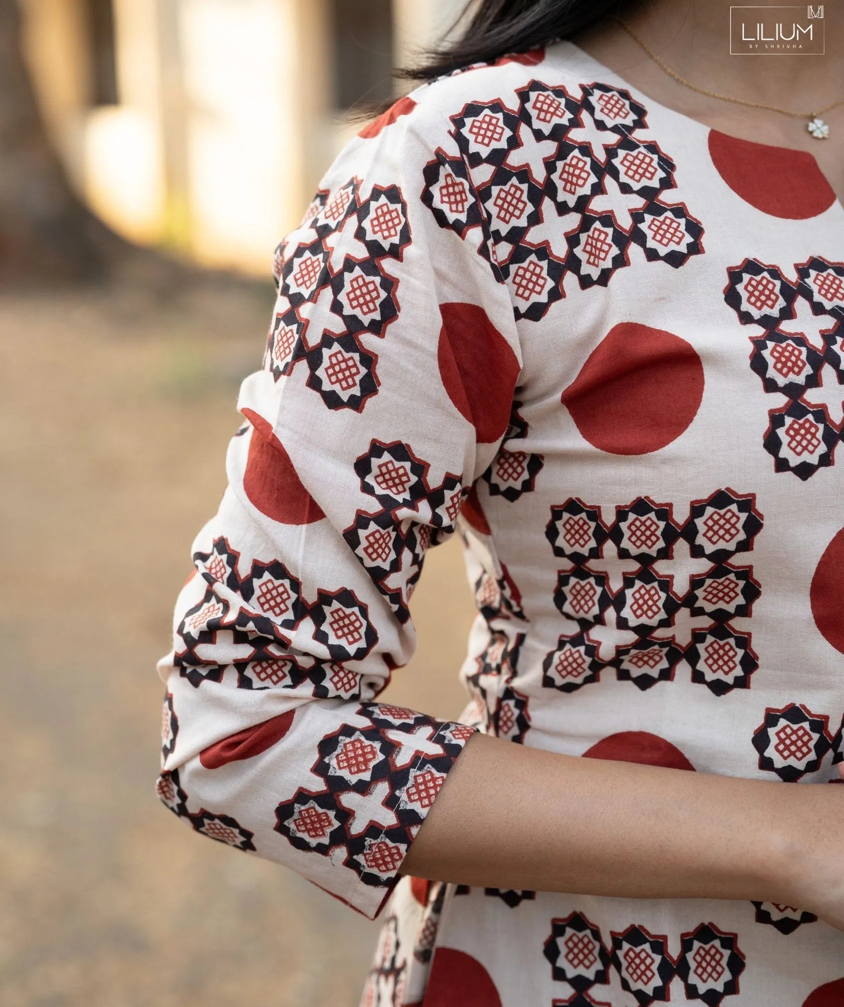 Featuring 3/4 sleeves and functional side pockets, it blends practicality with timeless style. The soft lining adds comfort and a refined finish, making it suitable for regular wear. The elegant Ivory Sindoor Mosaic color palette brings subtle visual interest while remaining versatile for styling with minimal accessories.