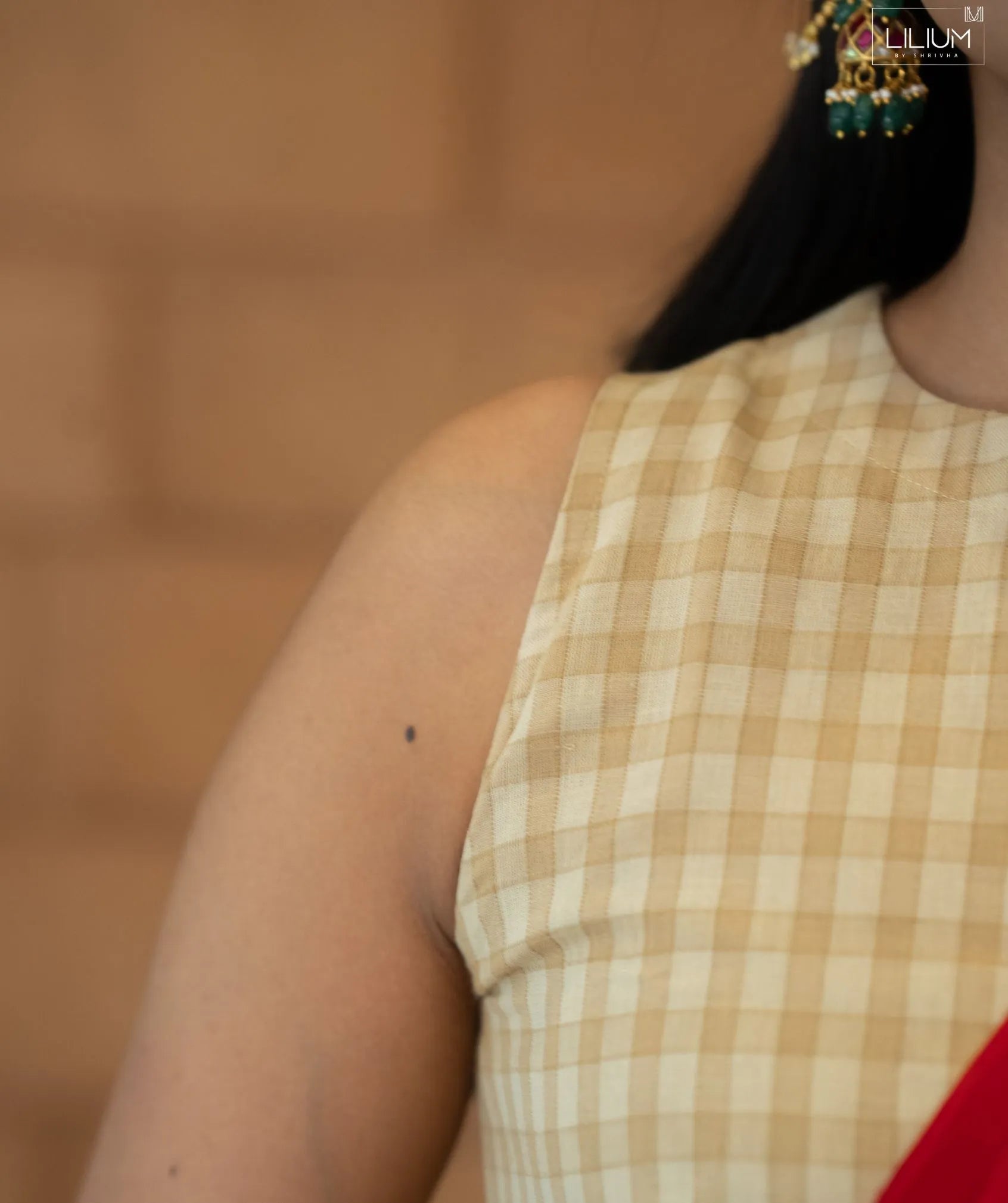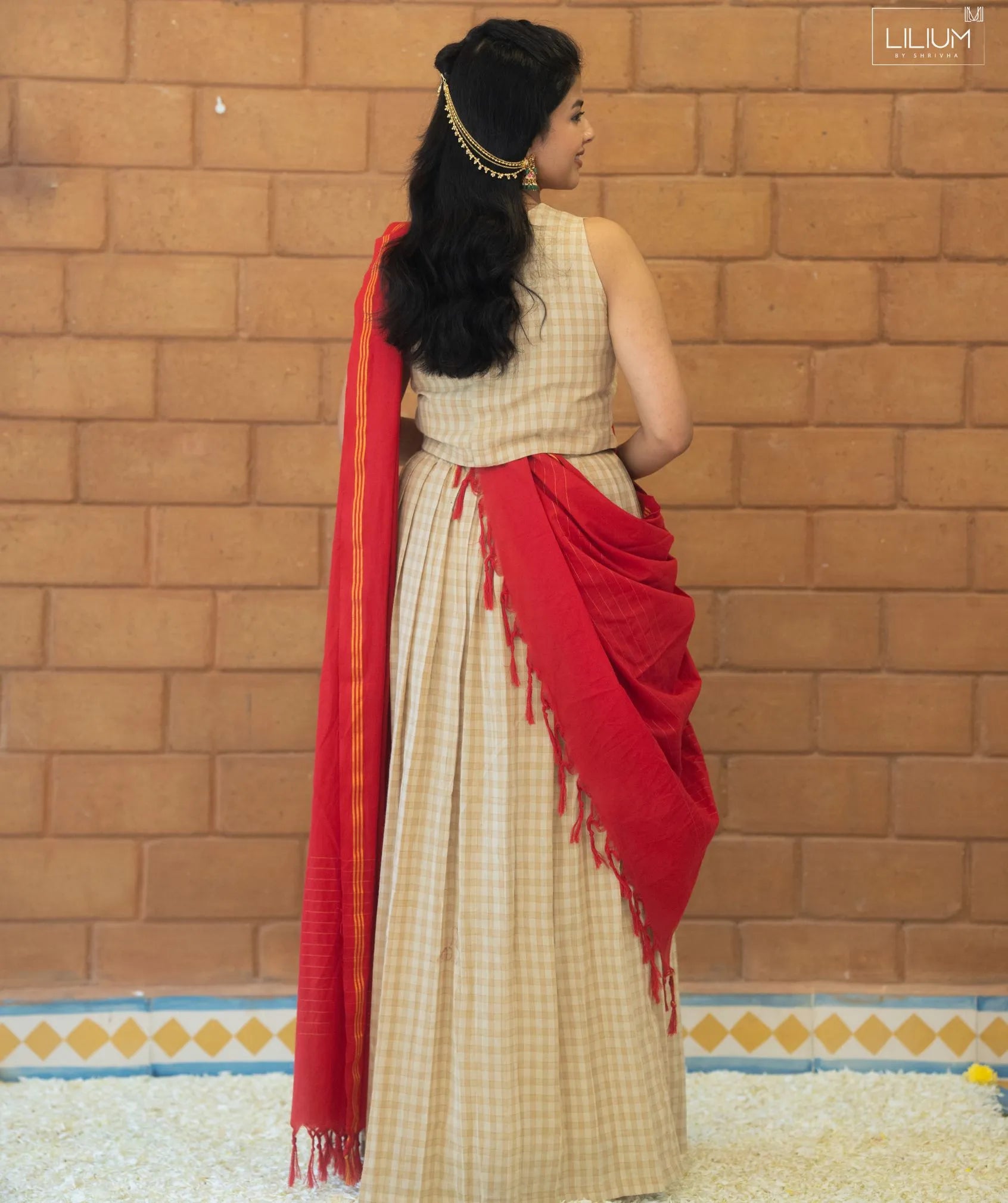 Celebrate festive elegance with this Royal Ecru Checks Cotton Handloom Crop Top Skirt Set, thoughtfully designed for comfort and style. Made from cotton handloom fabric, this ensemble features a 14.5-inch crop top paired with a 40-inch flowing skirt, offering a balanced and graceful silhouette. The set is fully lined for added comfort and structure. A red shawl complements the royal ecru check pattern, enhancing its festive appeal. The crop top includes attached sleeve fabric on the inside, allowing flexible styling. Ideal for festive wear, this outfit reflects traditional craftsmanship with a contemporary touch. Designed without pockets for a clean finish, it is perfect for special occasions where elegance matters.