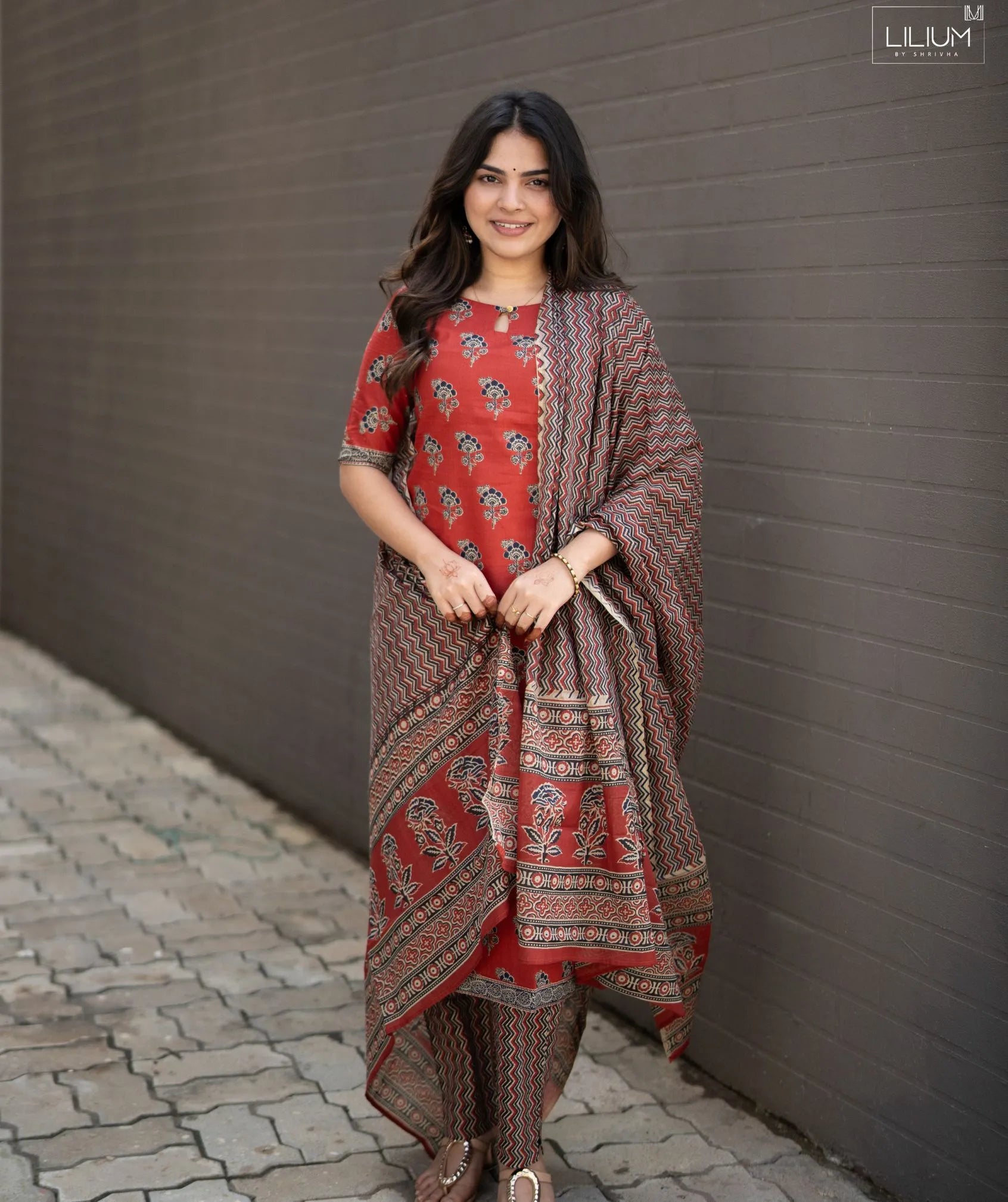 Step into effortless style with this Rustic Red Bloom Handloom Cotton 3-Piece Set, designed for comfort and everyday elegance. Crafted from breathable handloom cotton, the set features a 44-inch top length with elbow sleeves for a relaxed yet polished look.