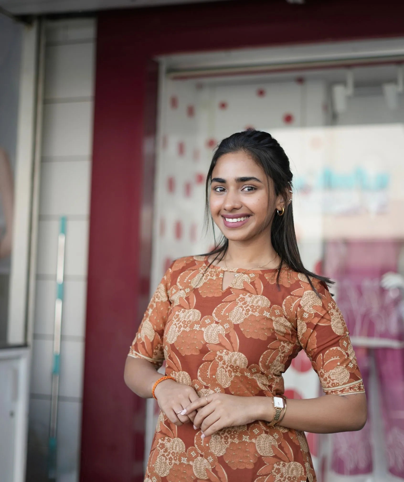 Refresh your everyday wardrobe with this Rusty Terracotta Floral Cotton Co-ord Set, designed for effortless casual style. Crafted from breathable cotton fabric, this coordinated set offers comfort while maintaining a structured look. The 45-inch top pairs perfectly with the 38-inch bottom, creating a balanced silhouette suitable for daily wear.