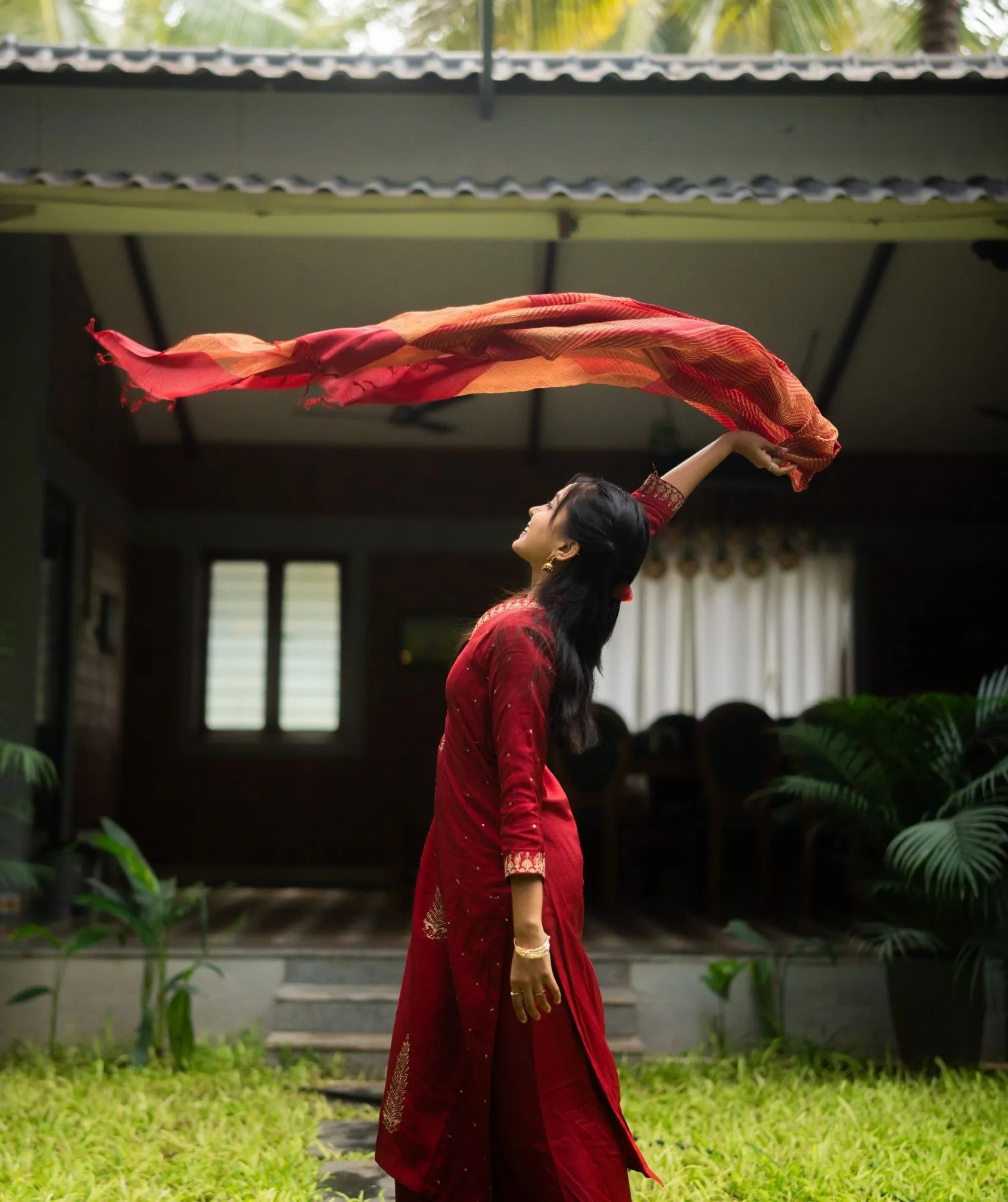 The 3/4 sleeves add a balanced silhouette, while the functional pockets enhance everyday practicality without compromising style. Fully lined for comfort, this set is ideal for festive gatherings where elegance and ease matter. The rich Vermilion Grace shade elevates the look, making it a standout choice for celebrations.