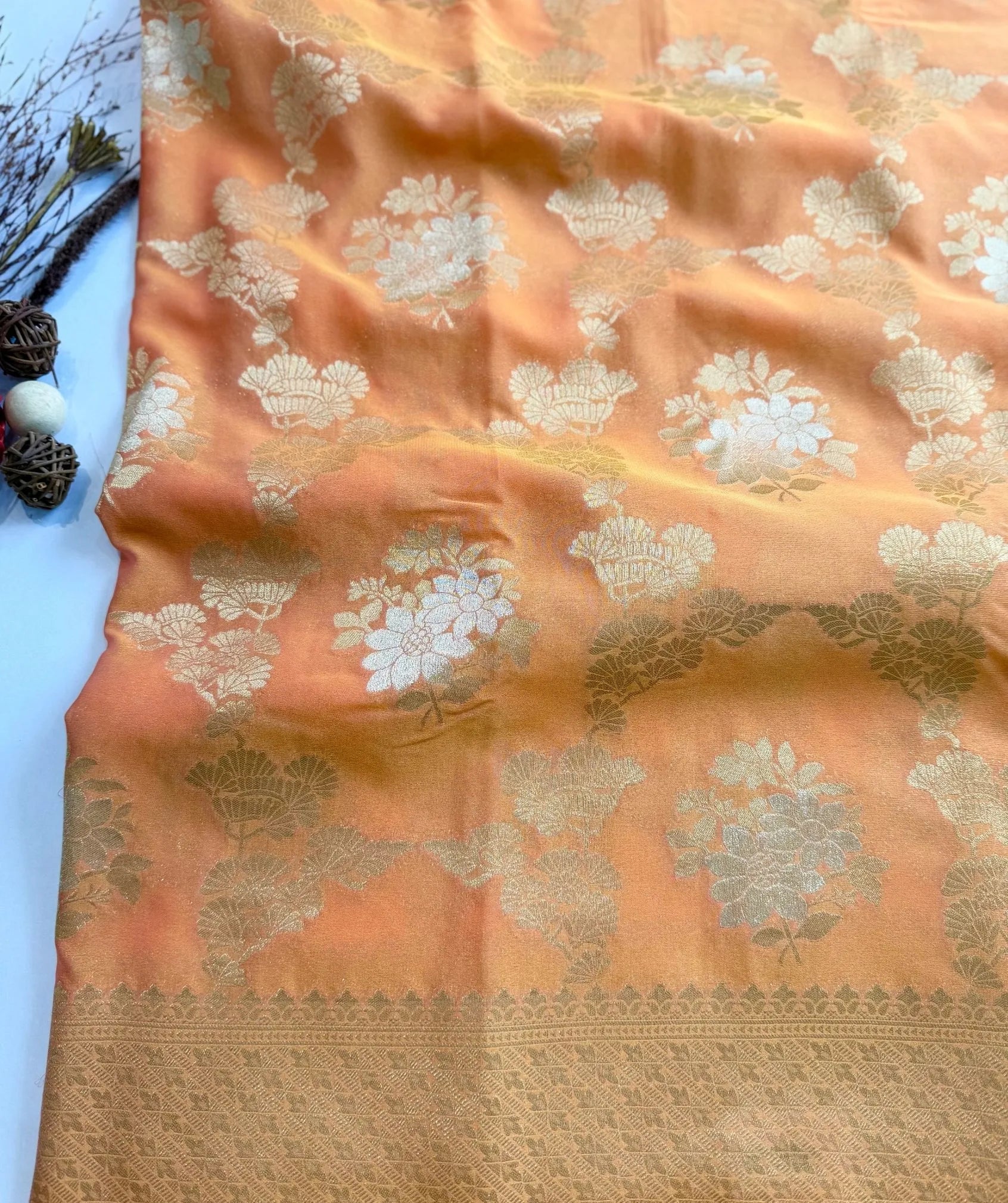 Peach Coral Banaras Saree with Zari Work – Festive Wear