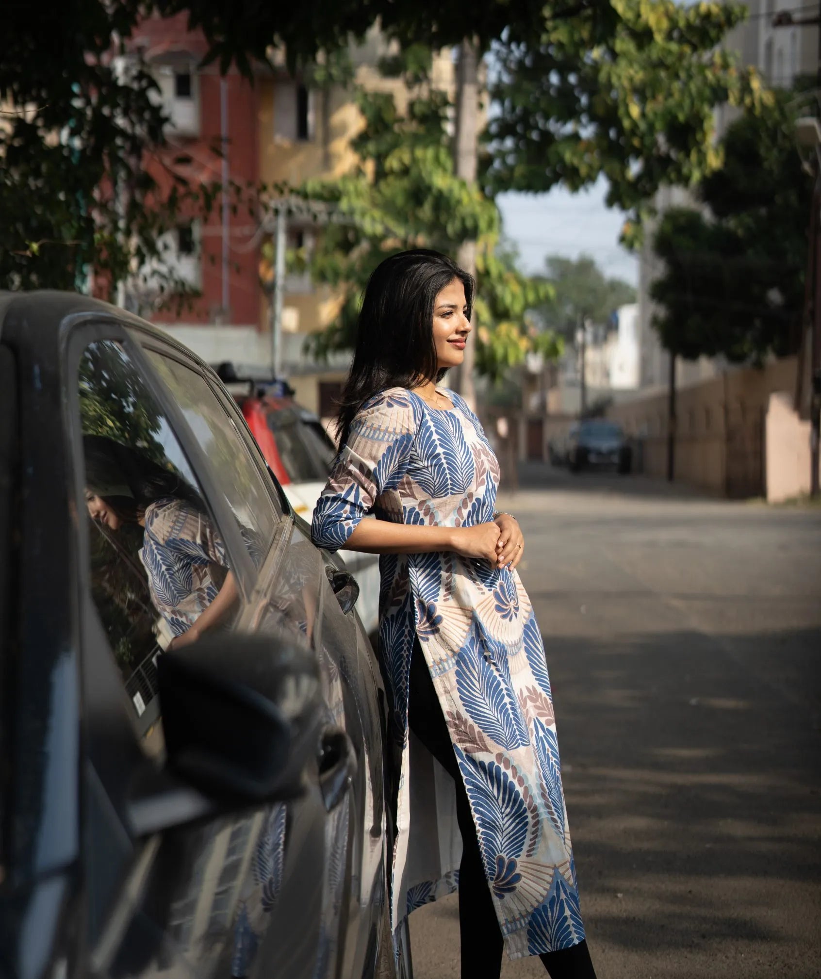 Indigo Fern Mist Cotton Kurti with 3/4 Sleeves – Lined