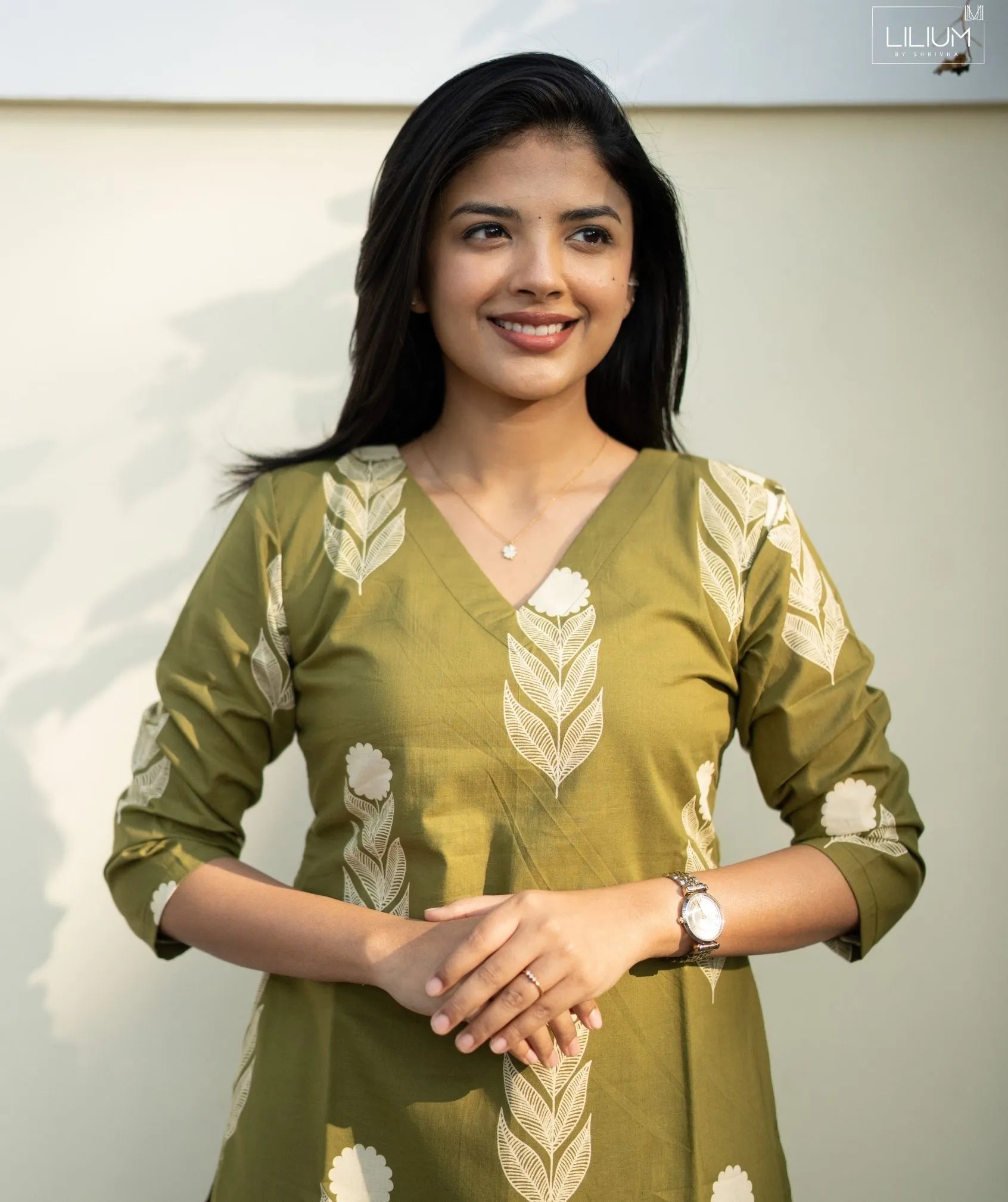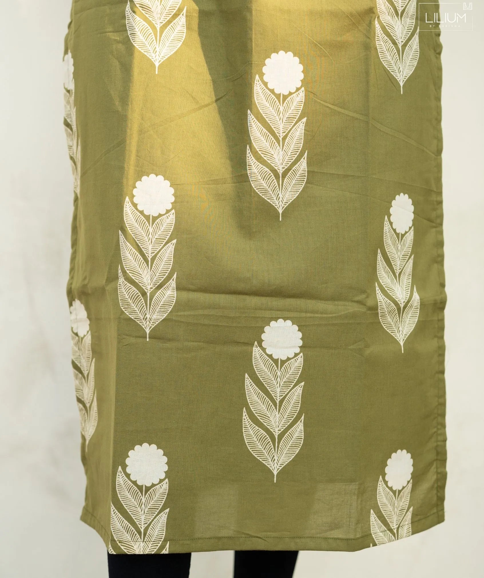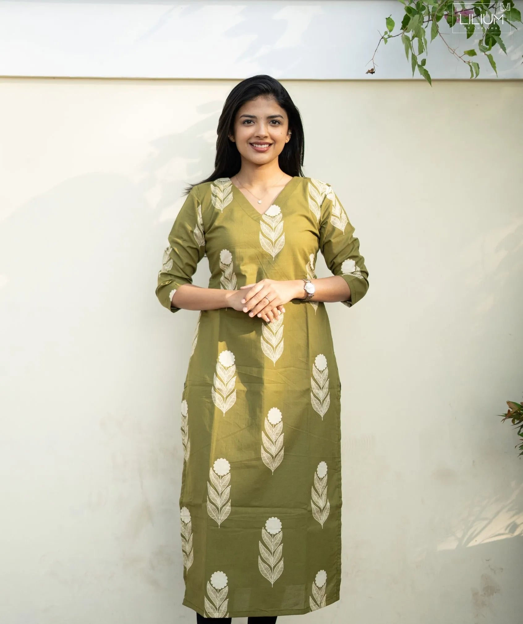 Olive Meadow Glow Cotton Kurti – 3/4 Sleeve Casual