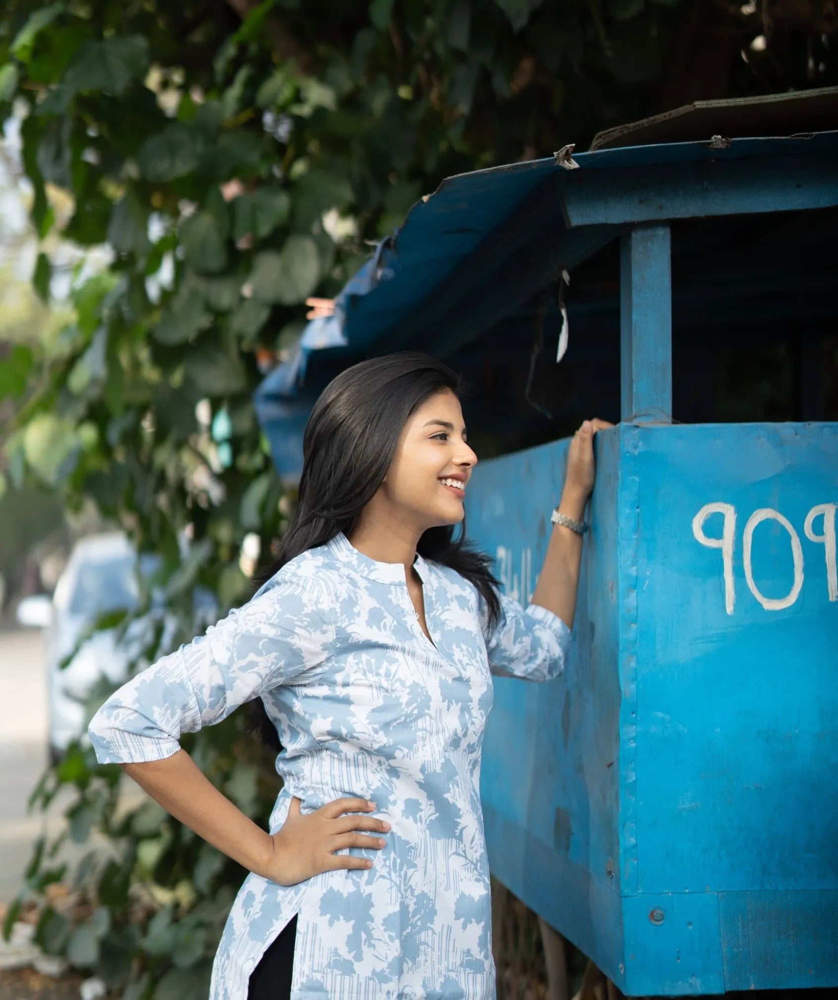 Skyline Blossom Blue Cotton Kurti – 3/4 Sleeve Style