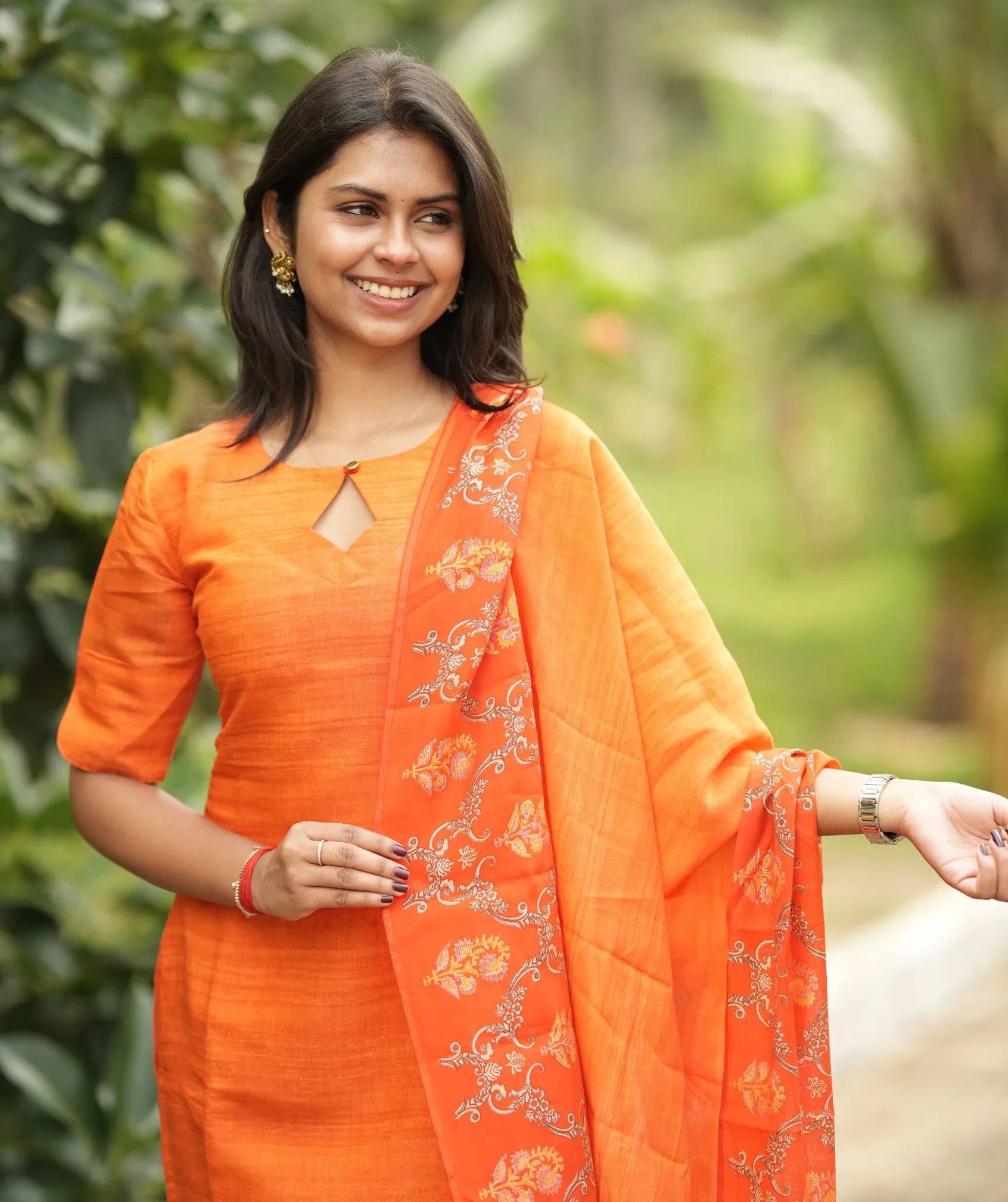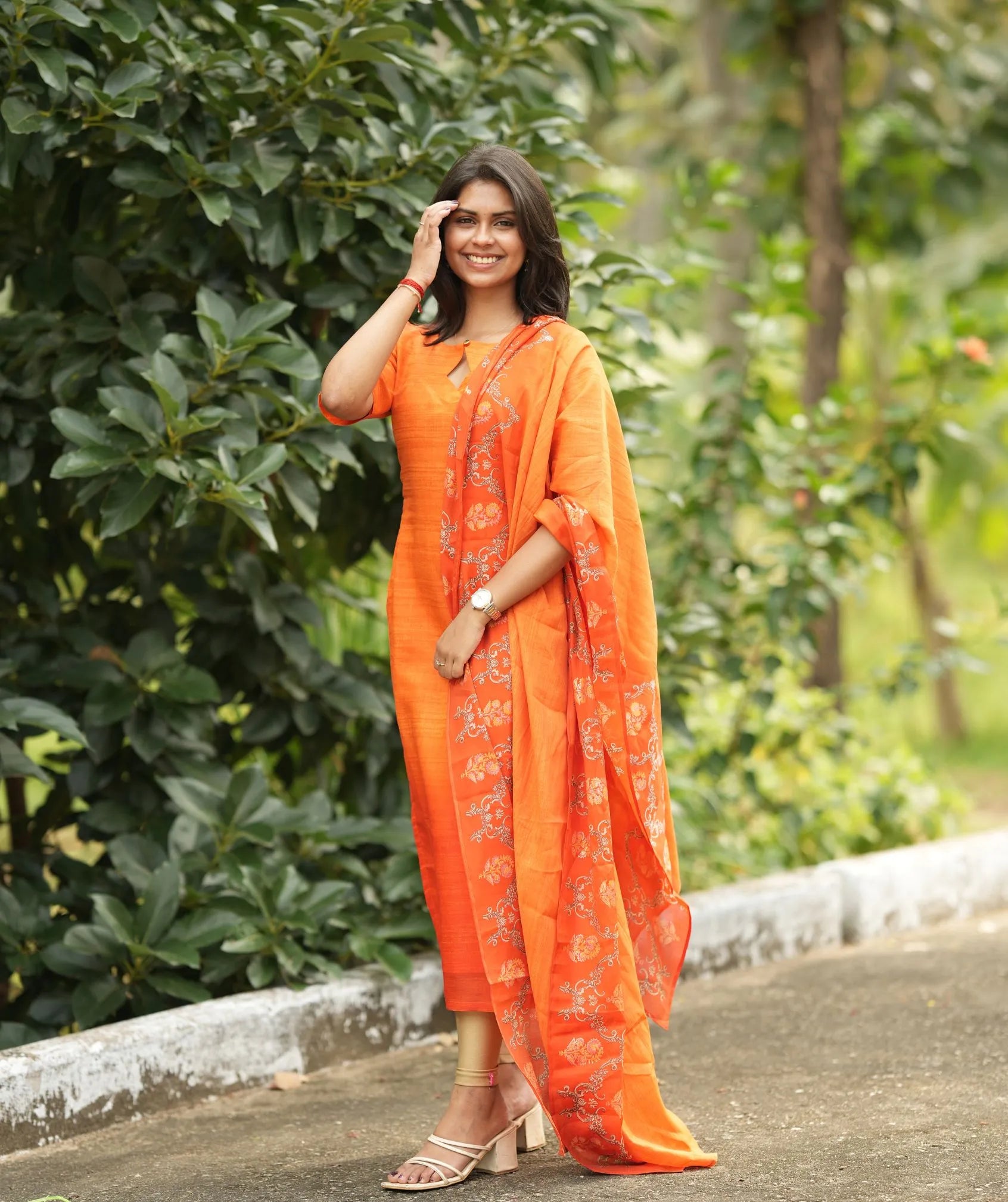 Step into effortless elegance with the Saffron Glow Chanderi Kurti with Shawl, designed for modern casual wear. Crafted from breathable Chanderi fabric, this 45-inch kurti offers a graceful silhouette with a soft, refined texture. The 3/4th sleeves provide everyday comfort, while the coordinated shawl enhances the overall look, making it easy to style for relaxed outings or daytime gatherings. Fully lined for a smooth finish, this kurti set balances comfort with understated sophistication. Its vibrant saffron tone adds warmth and freshness to your wardrobe, making it a versatile choice for women who prefer timeless ethnic wear with contemporary appeal.